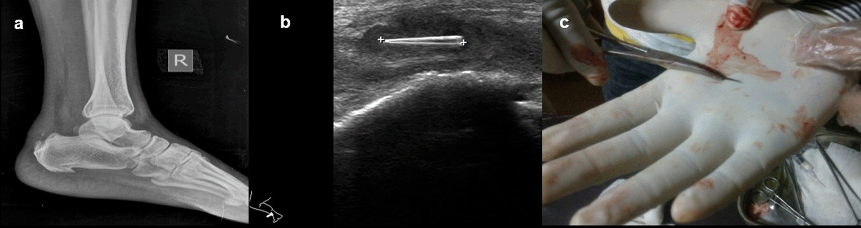 USG revealed that a well-defined thorn visualized in the Achilles tendon with associated changes of tendinitis (b). Thorn removed under ultrasound guidance (c).