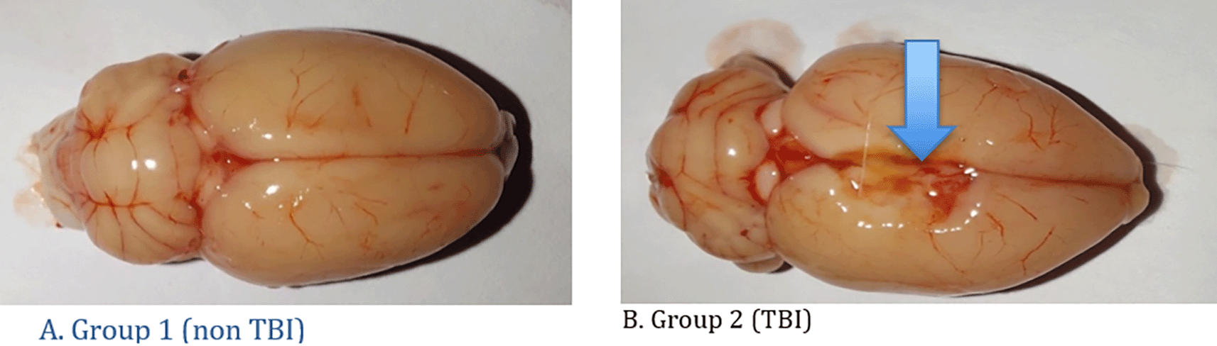 A. Group 1 (non TBI): It was seen that there were no changes in the rat brain and there were no lesions in the brain; B. Group 2 (TBI): There is a lesion in the right side of the brain due to head trauma (blue arrow).