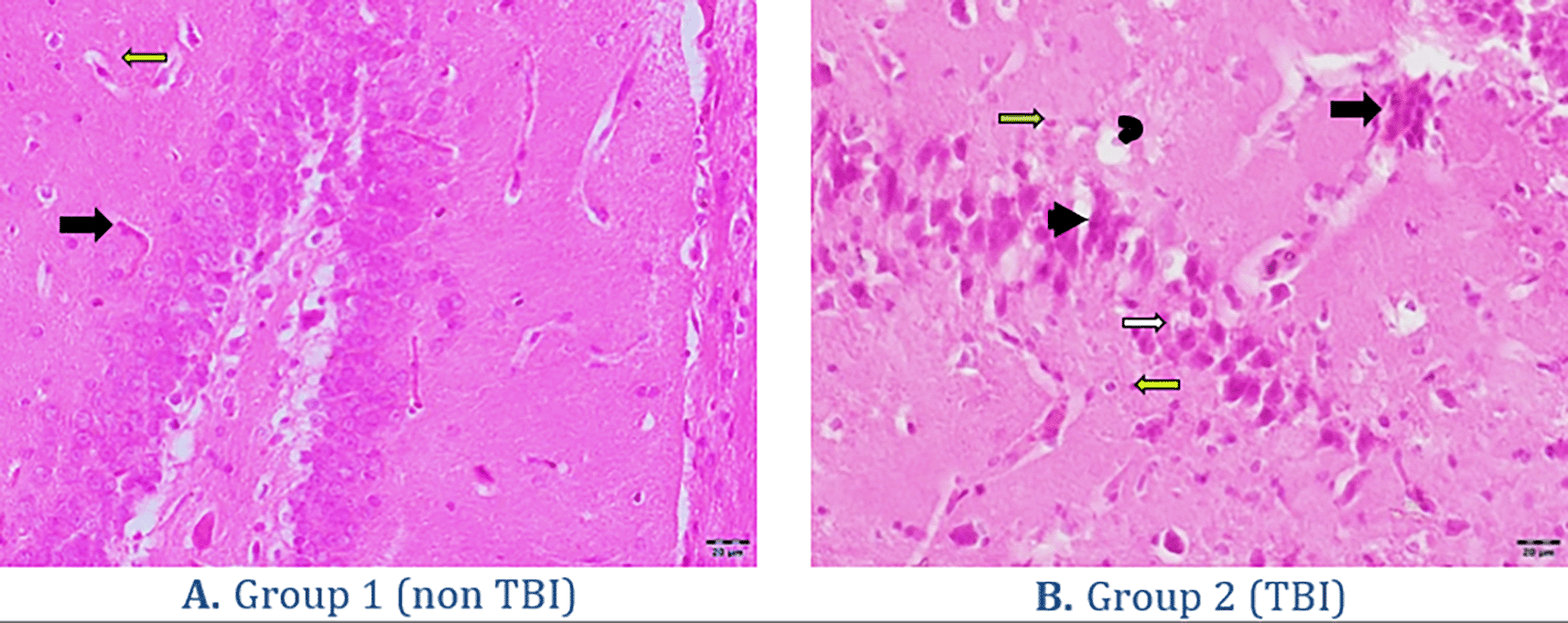 (A) represents the group without treatment. (B) represents the treatment group with traumatic brain injury. Black arrow = congestion, white arrow = degeneration, headed arrow = necrosis, concave arrow = apoptosis, yellow arrow = hemorrhage and green arrow = inflammatory cells. Hematoxylin Eosin Staining with 400× Magnification.