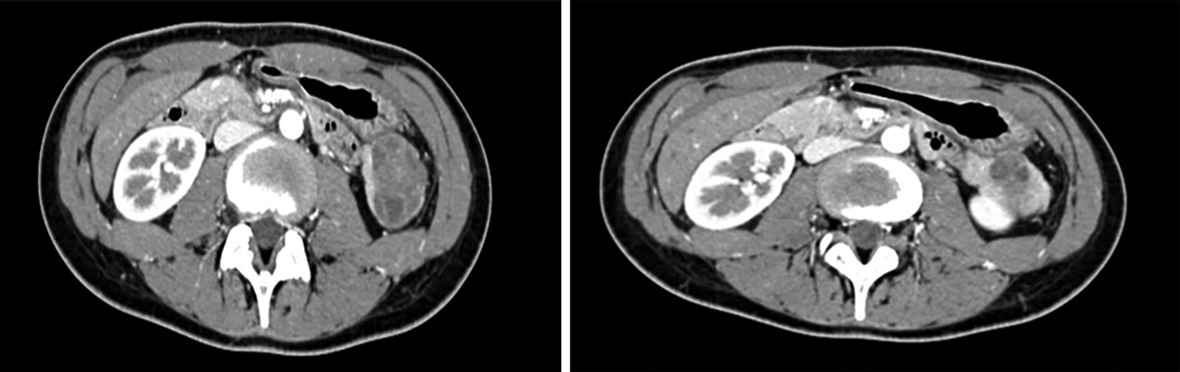 An abdominal computed tomography (CT) shows a limited heterogeneous lesion that is rather hypodense. It is not very vascularized. It is also of mixed composition associating solid and cystic zones and is little or partially enhanced at the periphery after injection of the contrast agent. Signs of compression of the adjacent organs can be observed. The magnetic resonance imaging (MRI) shows a heterogeneous lesion with a hyper signal in T1 and T2. The capsule is often visible in the form of a hypo-intense border in T1.13,14