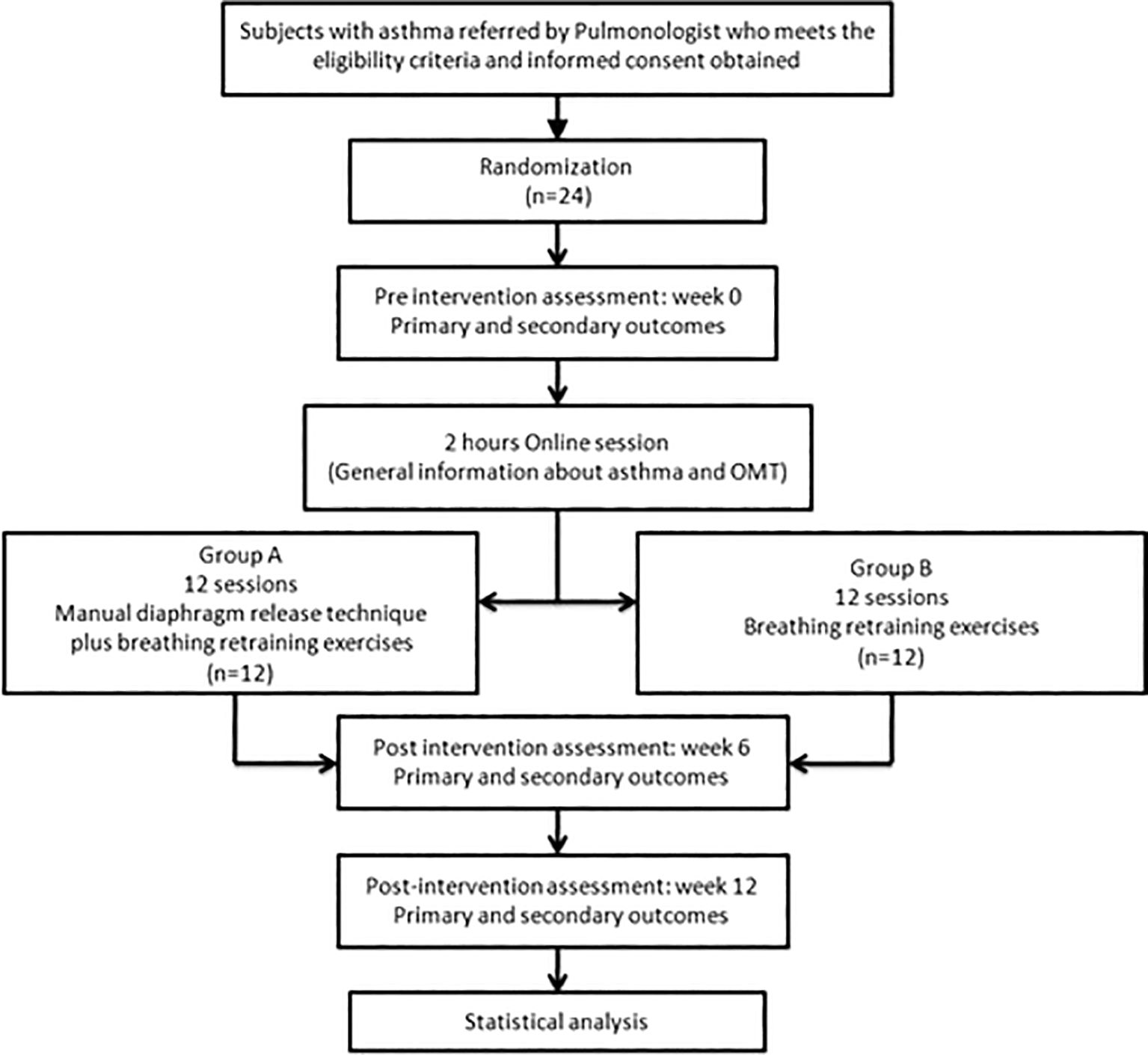 The evaluations will take place at three time - points: prior to treatment (week 0), post-treatment (week 6), and three months subsequent (week 12). The primary outcomes will entail the measurement of diaphragm excursion using ultrasound 40 and chest expansion (CE) using a tape measure. 41 Secondary outcomes will also be employed: maximal inspiratory and expiratory pressures (MIP/MEP), 42 , 43 dysfunctional breathing (Nijmegen questionnaire – - NQ), 44 asthma Control (ACT), 45 , 46 quality of life (SF-12v2), 47 and dyspnea (Borg scale). 48 Table 1 illustrates the SPIRIT schematic protocol of the study along with the schedule of assessments.