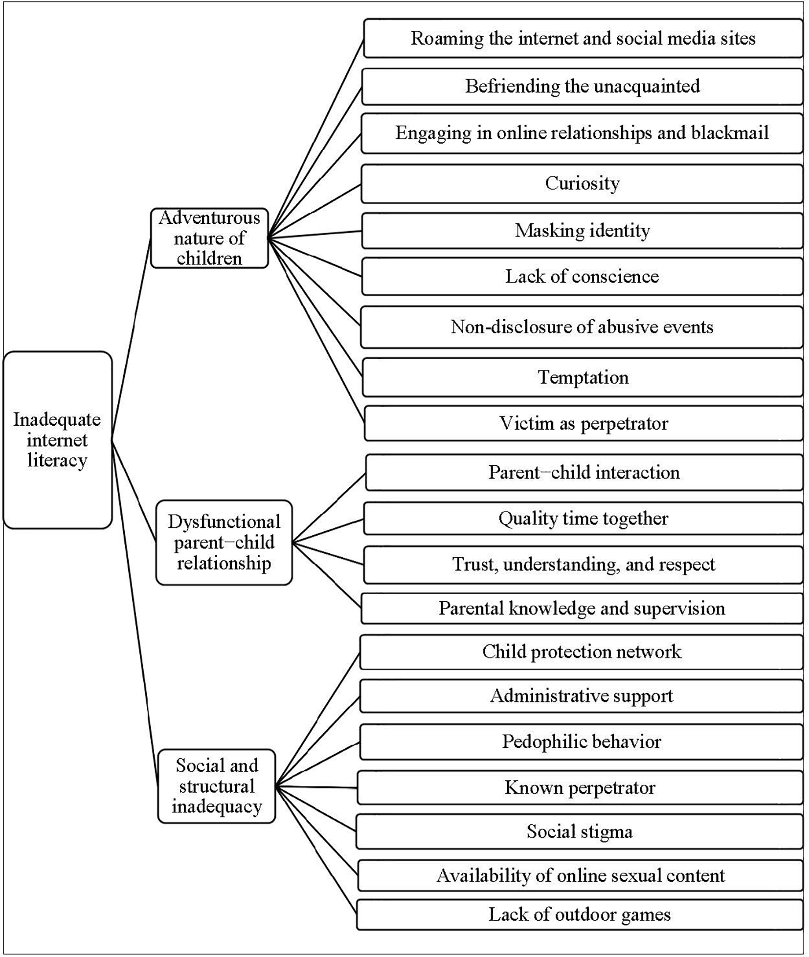 The main theme that emerged from the analysis is inadequate internet literacy as the root cause of online child sexual abuse (OCSA) in Bangladesh, which is also reflected in the categories. The following three categories resulted from the analysis: (a) the adventurous nature of children, (b) dysfunctional parent−child relationship, and (c) social and structural inadequacy (Figure 1). As each subcategory helps to establish the causes of OCSA, they shed light on how OCSA should be viewed from a socio-cultural point of view. Each category consists of 4 to 9 subcategories.