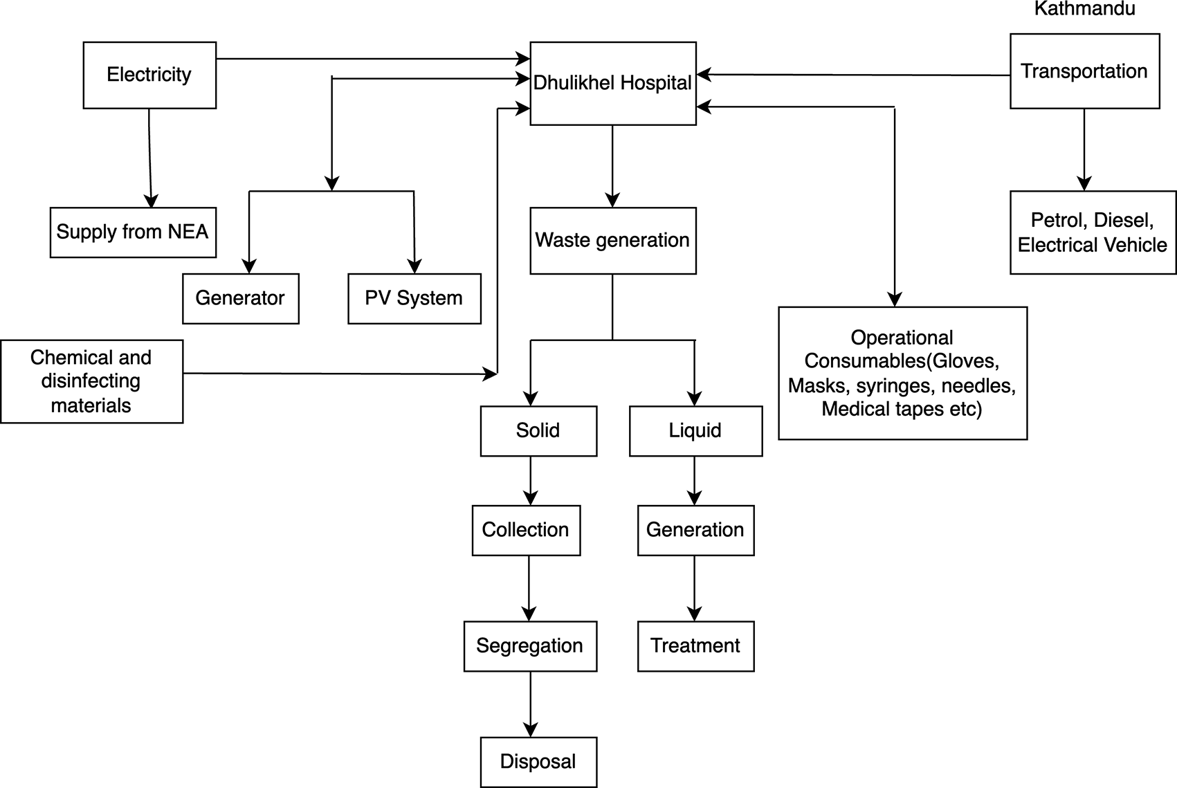 The field of study for this study is Dhulikhel Hospital. Dhulikhel Hospital, a Kathmandu University hospital has 18 health centers with 475 medical beds. Dhulikhel hospital is one of the largest hospitals of Nepal. The functional unit considered is kg CO2-eq per year, with the consideration of transportation mediums life cycle of 20,000 km per year. A gate-to-gate analysis has been employed considering the simplicity of analysis, mainly due to the involvement of considerable numbers of sectors to be assessed.