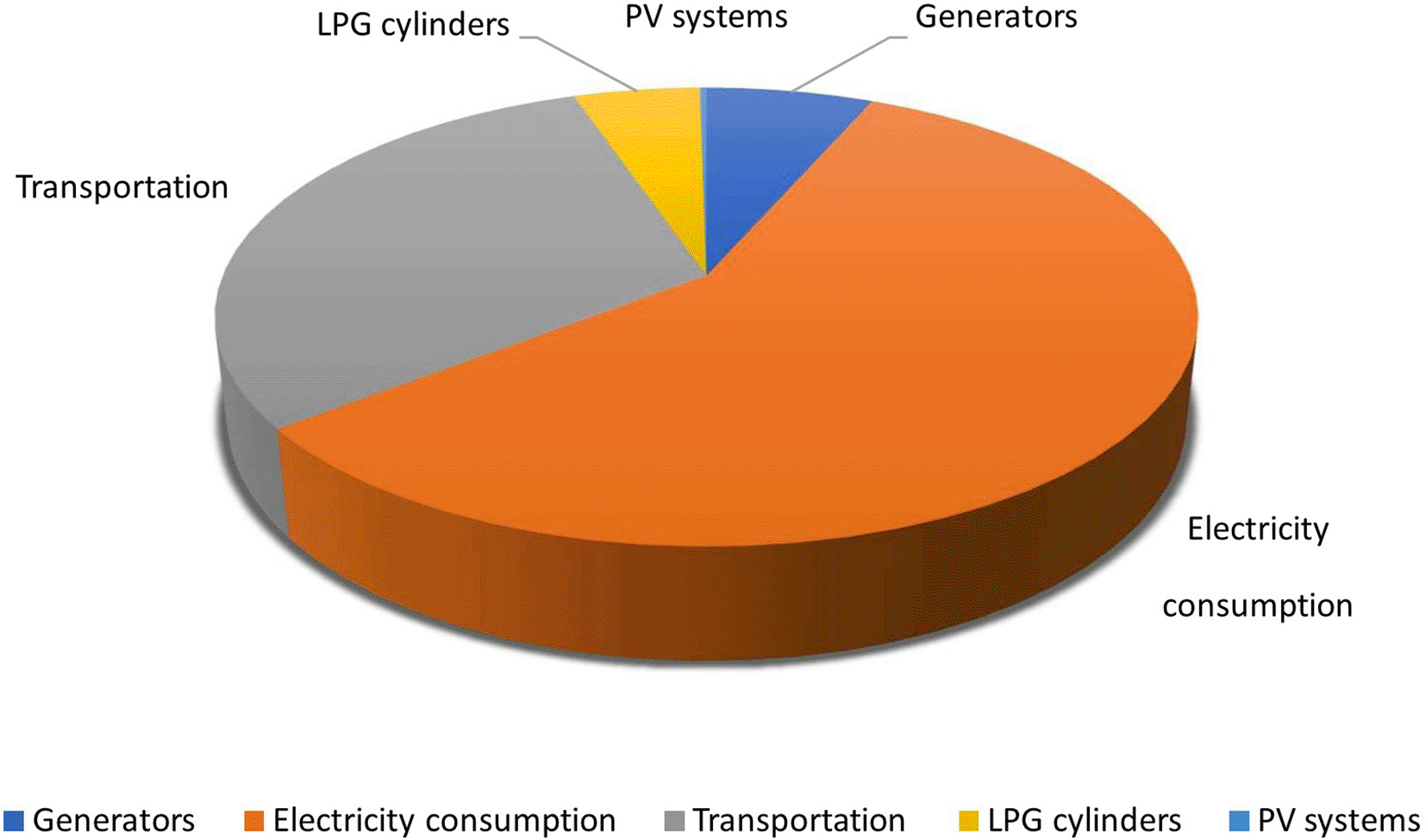 Liquified Petroleum Gas (LPG) is a clean alternative to traditional solid fuels that has received widespread attention due to its potential for scale. However, the climate, environmental, and health benefits or impacts of widespread LPG adoption in various low-income countries settings have not been thoroughly studied.25 In our case, it can be observed that the total amount of LPG in 1020 cylinders consumed by hospital would be 15,912 kg. Then, using the carbon emission factor of 1.51 kg CO2 per kg of LPG burned, it is found that the carbon footprint from consumption of LPG would be 44494 kg CO2-eq/yr.