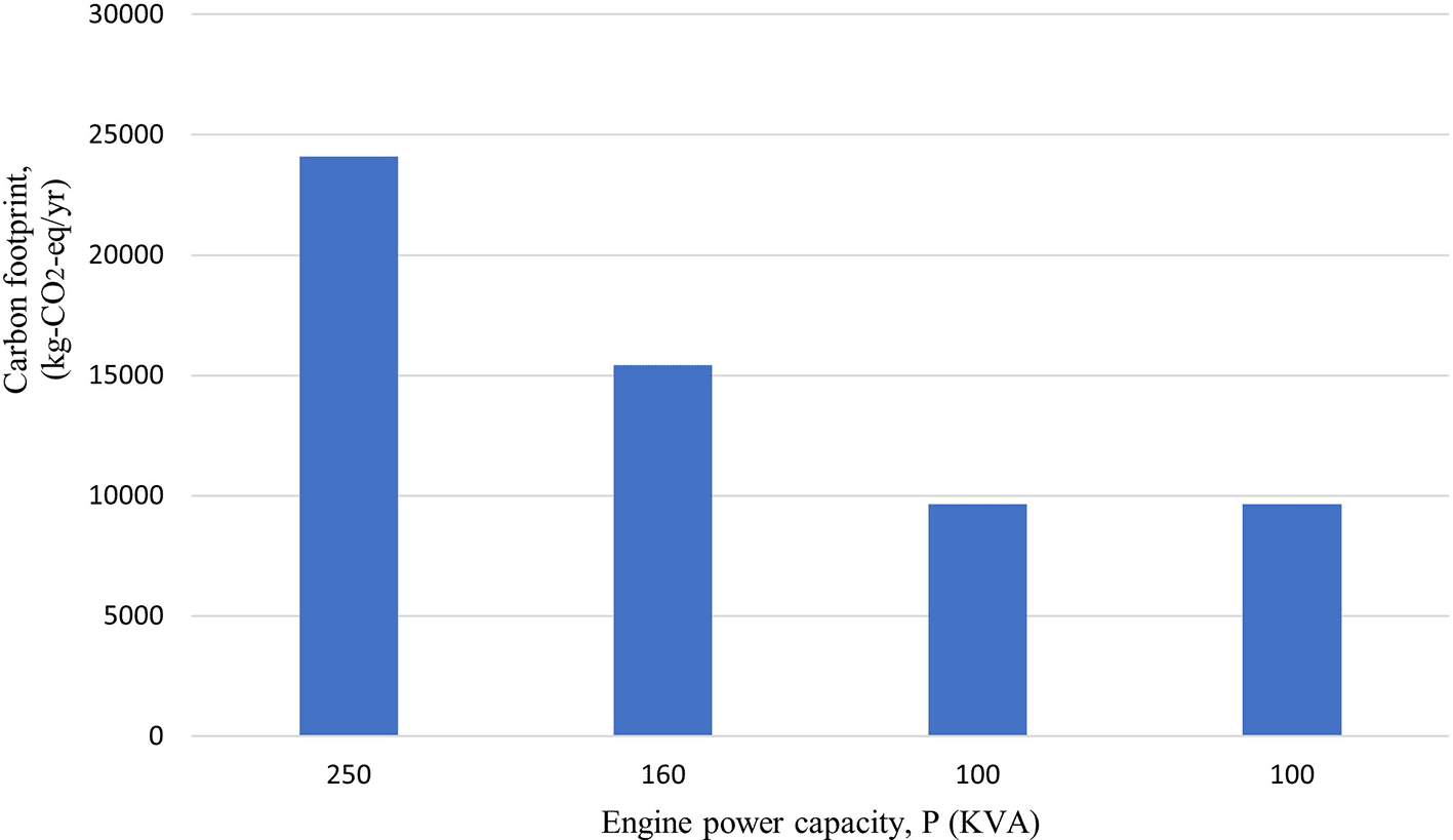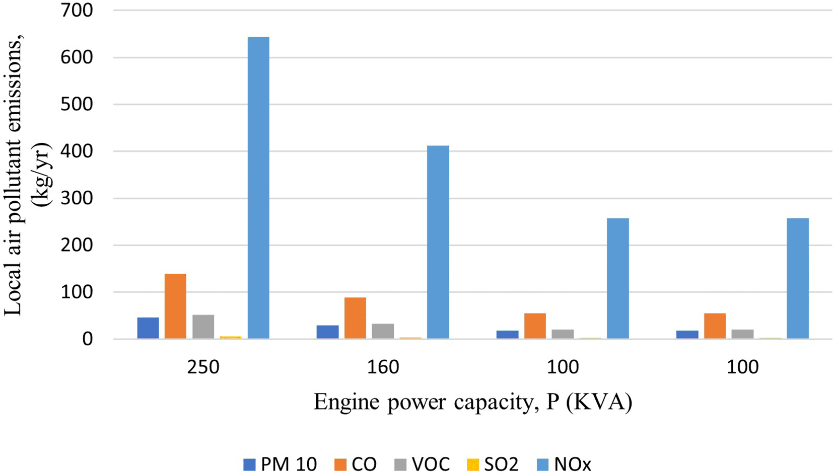 Total carbon emissions from the generators were found to be 58,780 kg-CO2-eq/yr. Along with total CO2-eq, the total local air pollutants; PM10, CO, VOCs, SO2 and NOX were found to be 112 kg/yr, 339 kg/yr, 125 kg/yr, 15 kg/yr and 1569 kg/yr, respectively. Figures 2 and 3 show the emission from the generators highlighting that the 250 kVA generator has the maximum emission. The emissions were found to be comparatively lower than the mentioned study as the generators is not operated in full time condition. The generators in hospital are operated in an average of 30 minutes per day (182.5 hours/yr) to ensure that they are working properly.