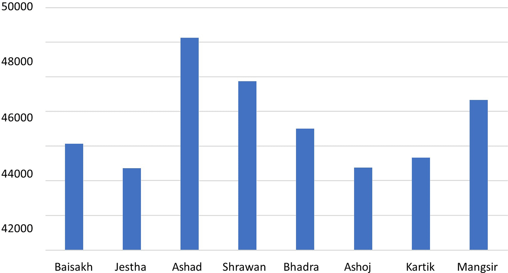 According to a study by the International Hydropower Association (IHA), the carbon footprint of hydropower is about 24 g-CO2-eq/kWh, which is much lower than the carbon emission of fossil fuels like coal (over 1000 g-CO2-eq/kWh).23 The hospital annually consumes 1,942,845 KWh electricity, and with the imported electricity carbon footprint (see Data File27), the GHG emission of electricity consumption was found to be 519,794 kg-CO2-eq/yr. The carbon emission is found to be highest in the month of June–July as shown in Figure 4, as the electricity consumption rate was highest.