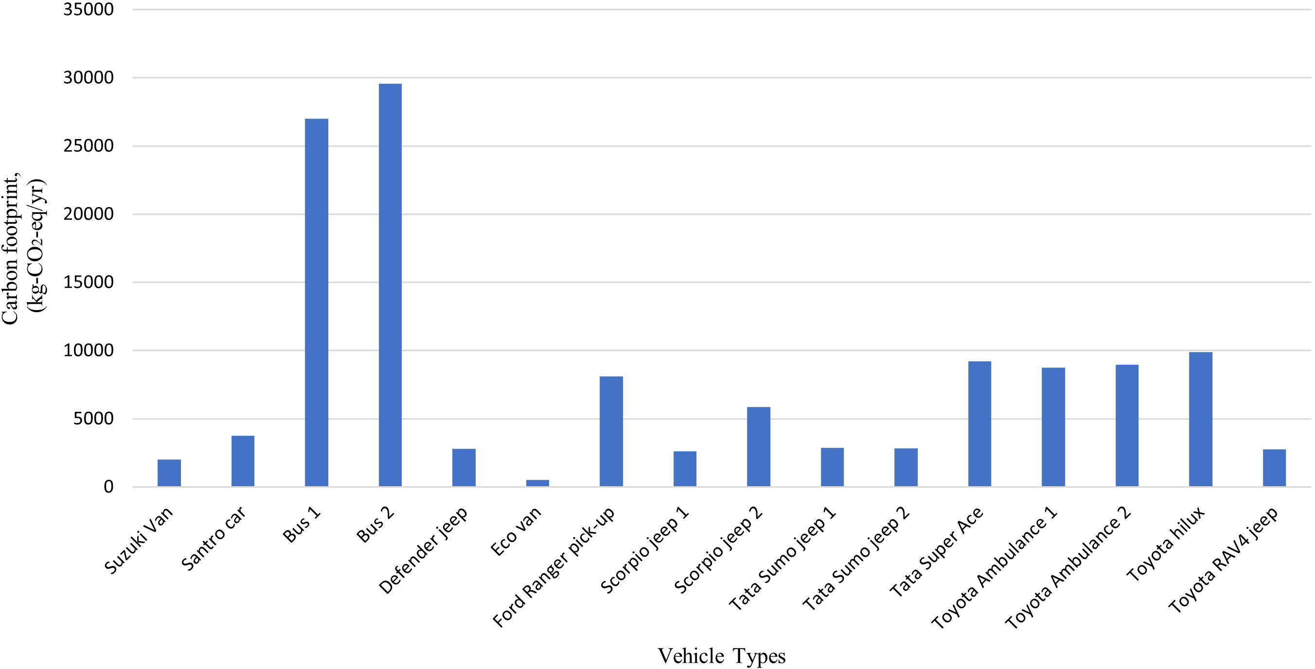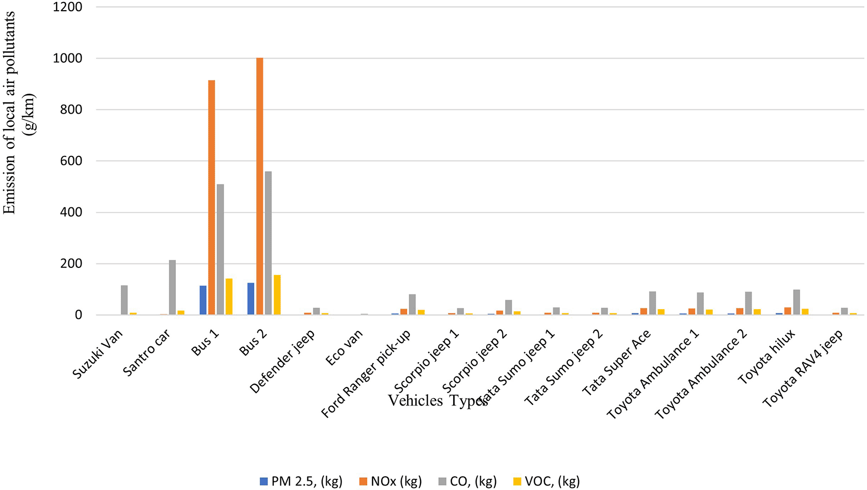 The total carbon footprint of 16 hospital vehicles was found to be 127,453 kg-CO2-eq/yr, and the other local polluting agents: PM2.5, NOx, CO and VOC were calculated to be 289 kg/yr, 2115 kg/yr, 2053 kg/yr and 481 kg/yr, respectively. The buses used for staff transportation exhibit the highest levels of carbon emissions with 26,994 kg-CO2-eq and 29,582 kg-CO2-eq annually as shown in Figures 5 and 6. Compared to other vehicles used by the hospital, the buses also emit the highest levels of local air pollutants annually.