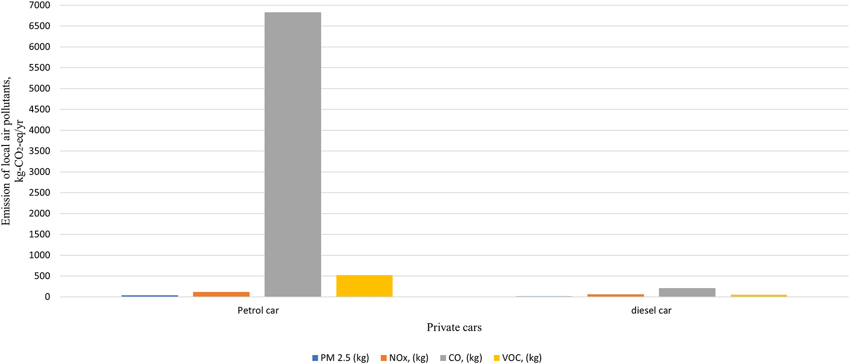 The total carbon emissions from 44 Spark Ignition (SI) vehicles were found to be 124,523 kg-CO2-eq/yr, i.e., one SI vehicle emits 2830 kg-CO2-eq/yr, while used for transportation of hospital activity only, while five Compression Ignition (Diesel) vehicles emit 14,334 kg-CO2-eq/yr, i.e., one CI vehicle emits 2867 kg-CO2-eq/yr while used for transportation of hospital activity only. Diesel vehicles emit a slightly higher carbon footprint compared to Spark ignition vehicles due to their superior fuel efficiency. In comparison to other local polluting agents, the total amount of CO found was the highest, measuring 7039 kg/yr in total, as shown in Figures 7 and 8.