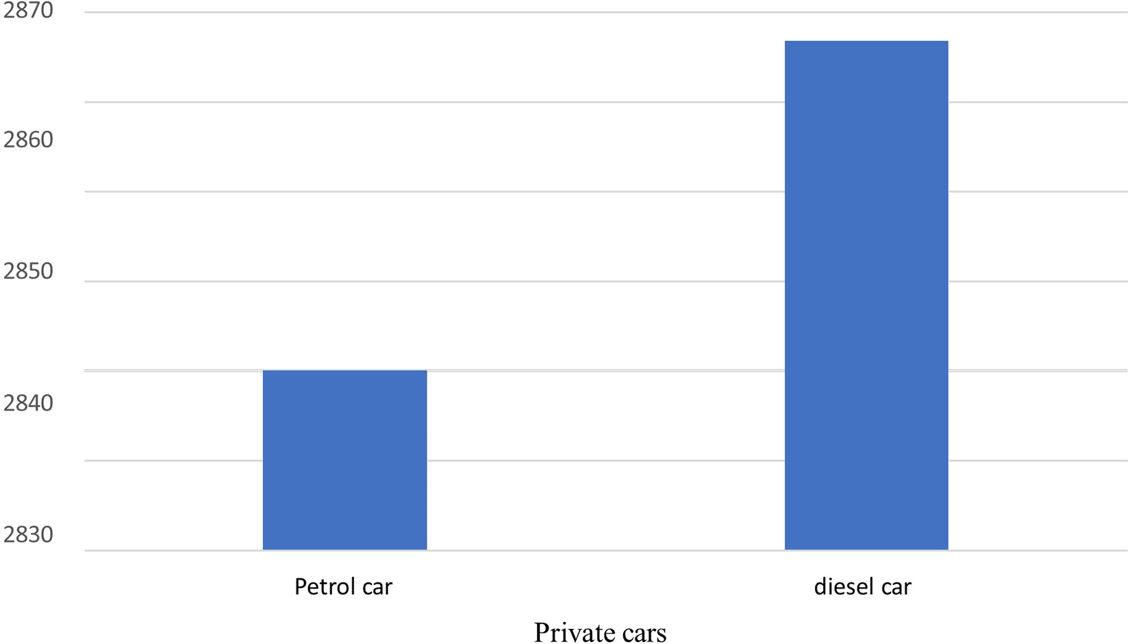 The carbon emissions from electric cars were found to be relatively lower, measuring 2022 kg- CO2-eq/yr, as compared to those from petrol and diesel cars because they do not have traditional internal combustion, they use battery as power source. So, electric vehicles (EVs) do not emit GHGs like CO2, CO, PM, NOx during their operation. EVs that release no greenhouse gases locally, are considered to be a potential response to the concerns of climate change and environmental pollution.24