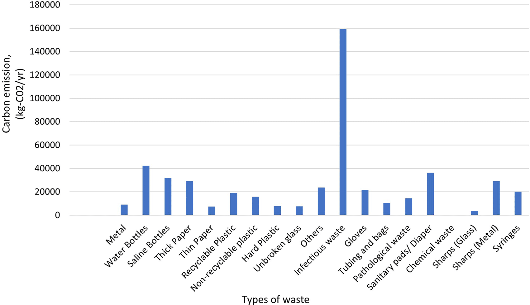 Direct emissions in the healthcare industry are relatively low as compared to other sectors.1 However, a sizable portion of the country's CO2 footprint can be attributed to emissions along the supply chain brought on by the healthcare sector's purchases of goods and services.1,2 In terms of energy consumption, hospitals and other healthcare facilities are major users of energy for heating, cooling, lighting, and the operation of medical equipment. The provision of healthcare and the acquisition of goods, energy use, transportation, services, and technological advancements from a carbon-intensive supply chain all contribute to the direct and indirect emission of greenhouse gasses (GHGs) in every country.3 Although health care services are essential for maintaining and enhancing human wellbeing, they also have an environmental impact that adds to the environmental risks to human health. Recently, concerns regarding how to make medical practices more sustainable due to the carbon footprints linked with healthcare have emerged.4,5 Healthcare produces a variety of waste streams, each with a distinctive method of disposal and thus a different carbon impact. The material composition and method of disposal, as well as the available options, determine the carbon footprint emerging from healthcare facilities. In order to access such emissions, life cycle assessment (LCA) is a suitable form.6–8