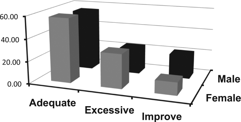 These differences can be interpreted from various perspectives. According to Doherty (1997), women tend to be more introspective and are socially conditioned to be more expressive and aware of their emotions, which could explain the higher frequencies in the “adequate” and “excessive” categories observed in females. In contrast, men, subject to certain sociocultural norms, might feel less encouraged to explore and understand their emotions, which could influence their perception of the need to “improve” in this area.