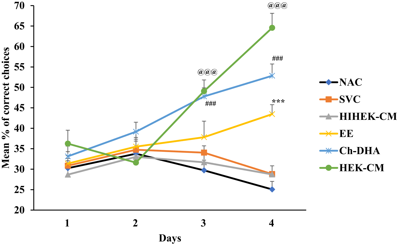 Human embryonic kidney stem cell conditioned media (HEK-CM) and choline-docosahexaenoic acid (Ch-DHA) mice vs heat inactivated HEK-CM (HIHEK-CM) or saline vehicle control (SVC) or normal ageing control (NAC) mice made significantly more correct choices on 3rd and 4th day of trials @@@ and ###p<0.001 respectively, whereas environmental enrichment (EE) exposed mice vs NAC mice made significantly more correct choices on 4th day of trial. ***p<0.001.
