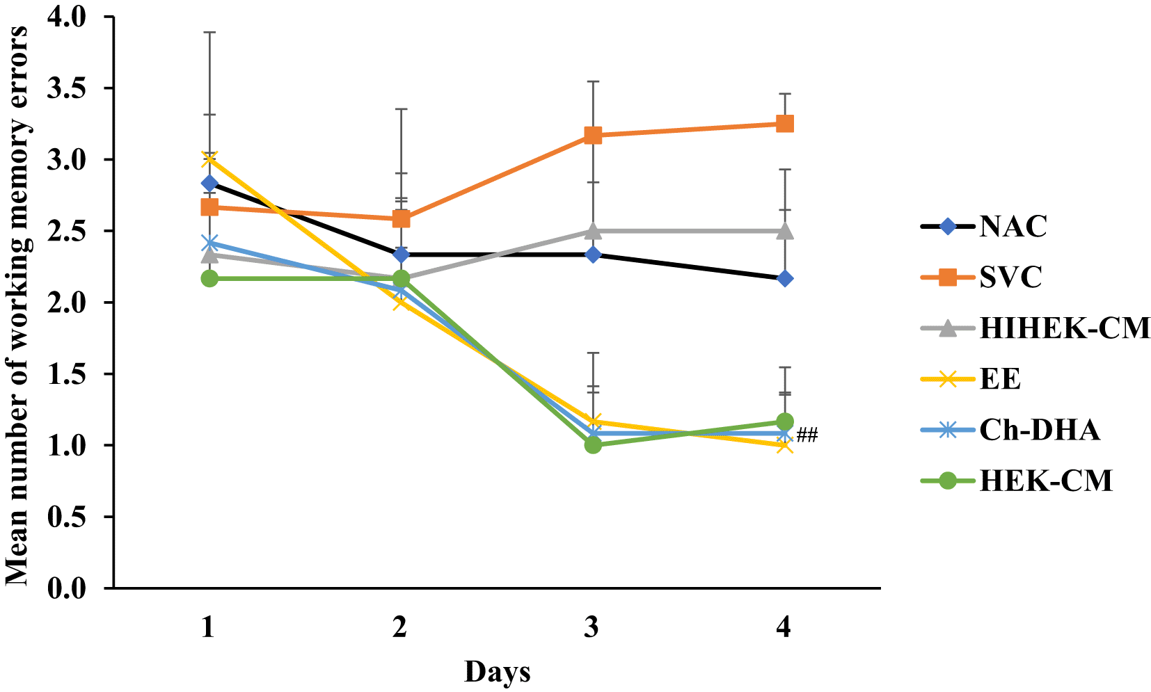 Human embryonic kidney stem cell conditioned media (HEK-CM) and Choline-docosahexaenoic acid (Ch-DHA) mice made slightly fewer mean numbers of reference memory errors on 3rd and 4th day of trials when compared with all other groups.