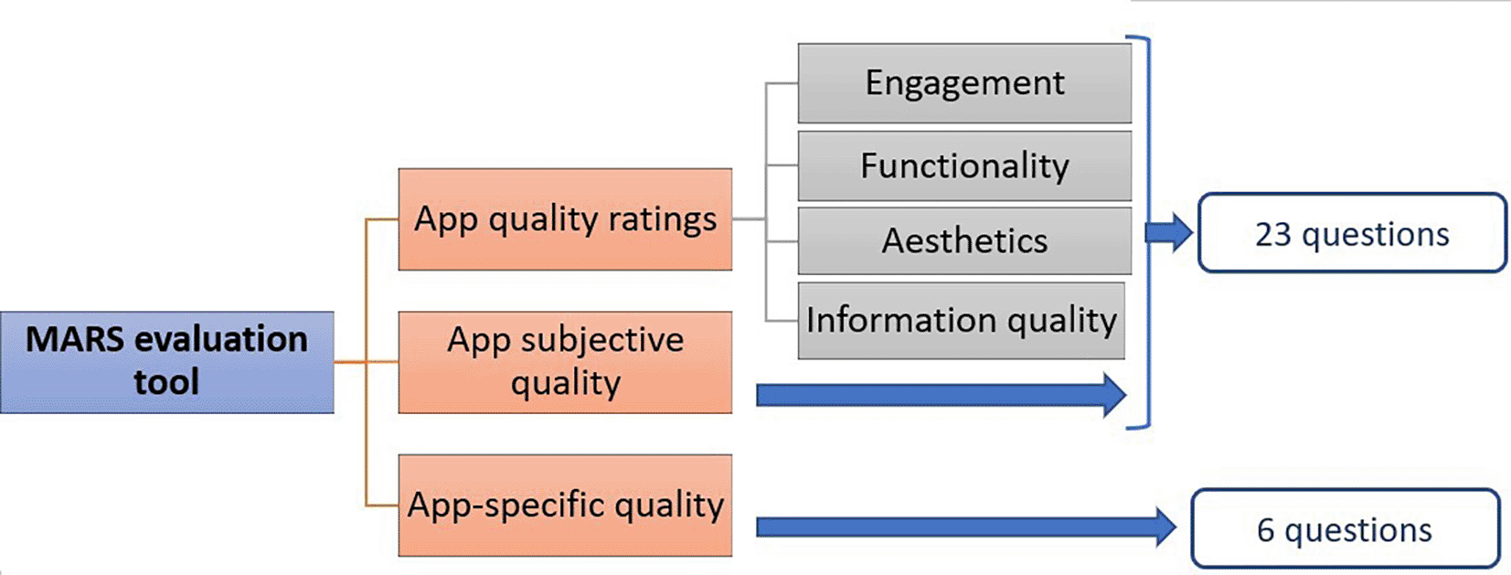 This study reviewed mobile applications for quitting smoking and used the MARS scale to rate the apps' quality. It is one of the most popular scales for evaluating the value and content of mHealth apps. It is a multidimensional tool for assessing the quality using semantic analysis and synthesis of existing literature.15 Engagement, functionality, aesthetics, and information quality are the four main dimensions that are assessed (Figure 1). The initial validation study demonstrated strong objectivity and reliability for the overall scale and subscales.16,17 The MARS' applicability for quality assessment was proved by a validation study with metric evaluation.17 As a result, MARS might be utilised to make the quality of apps transparent to patients and healthcare stakeholders.