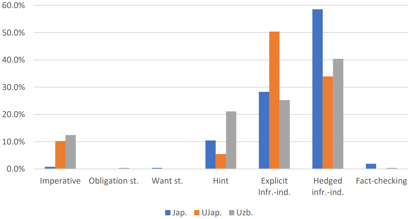 Figure 1 presents the percentages of each category of the head acts for which at least one example was found. Regarding explicit infringement-indication, which is the most direct in the RDW-type, the UJap. group used it almost twice as much as the native groups. In regards to hedged infringement-indication, which is more indirect than explicit infringement-indication, the Jap. group used it about 1.5 times more than the other groups. The Jap. participants used very few imperative compared to the UJap. and Uzb. participants. Regarding jint, Uzb. used it the most and UJap. used it the least.