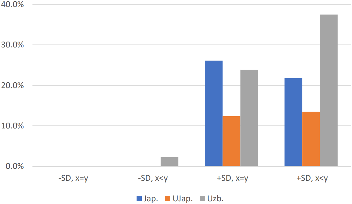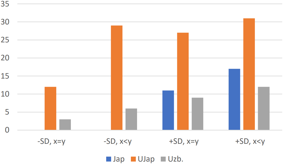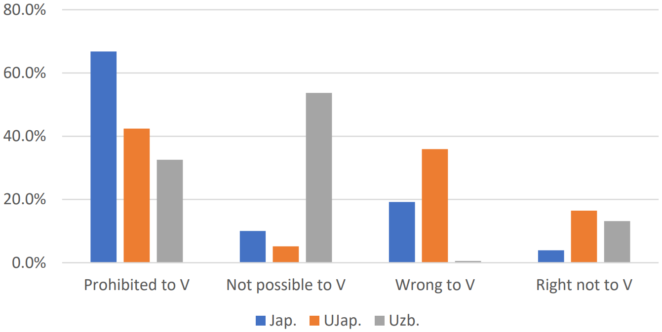 Figure 2 shows the percentages of the four predicate forms in the RDW-type categories. The Jap. group used the “Prohibited to Verb”-form which conveys the fact of prohibition most frequently at about 70%. The Uzb. group used the “Not possible to Verb”-form most frequently at about 50%. The UJap. group used “Wrong to Verb”-form as often as “Prohibited to Verb”-form at about 40%, respectively. When subclassifing the “Wrong to V”-form in the Jap. and UJap. data, in the Jap. group, we found 36 words for dame and 8 words for ikenai, and in the UJap. group, we found 19 words for dame and 58 words for ikenai. In other words, for the “Wrong to Verb”-form, the Jap. group used the word dame more frequently, while the UJap. group used the word ikenai more frequently.