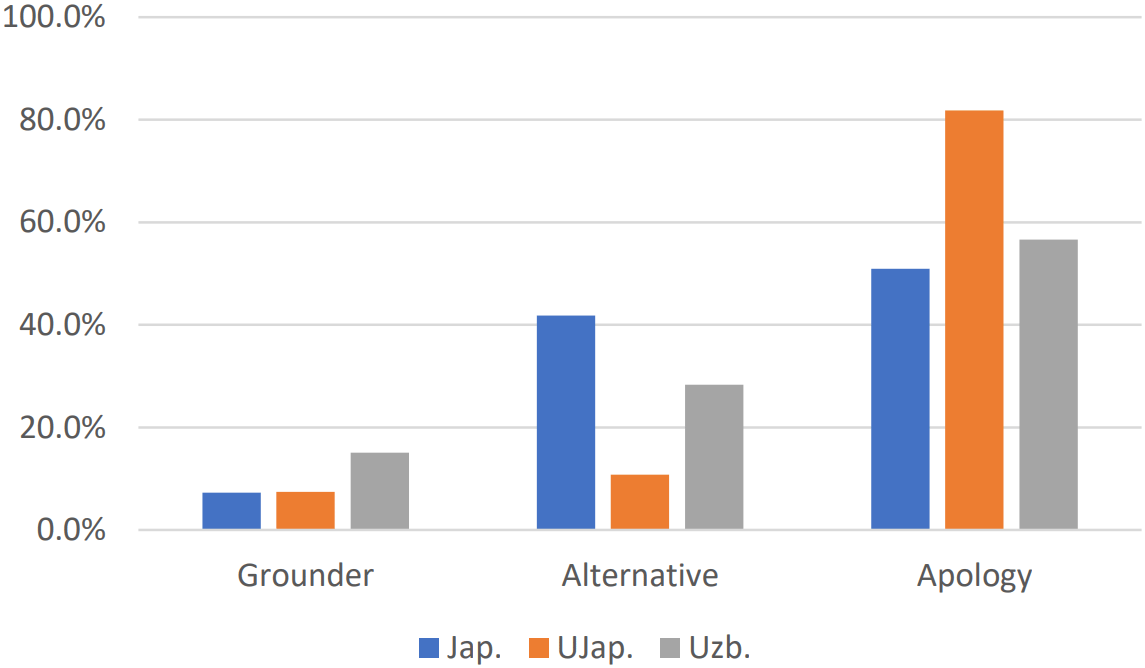 As Table 5 shows, Jap. and UJap. did not produce any examples of preparator and getting a pre-commitment in the supportive moves. The Uzb. participants also gave no examples of these categories. The DCT data revealed that apology11 almost always precedes a head act.