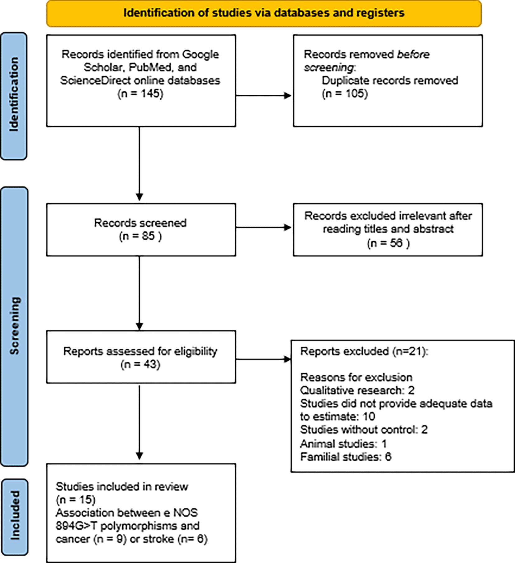 Determination of inclusion and exclusion criteria followed PICOS (Problem, Intervention, Comparison, Outcome, and Study design). The included studies were carefully examined to ensure their relevance and quality for our study. No national restrictions were imposed, meaning studies from all countries were considered eligible for inclusion. The research that met the eligibility criteria was carefully selected for our analysis: 1) Articles published in the English language that investigated the correlation between NO, especially eNOS 894G>T, and the risk of cancer and stroke; 2) Designed as a case-control study; 3) Articles that provided detailed data on genotype and allele frequencies of eNOS gene polymorphisms, which has sufficient data for the calculation of the odds ratio (OR) and the confidence interval of 95%. Therefore, studies were excluded according to as the following criteria: 1) Qualitative research; 2) No available genotype frequency; 3) Studies without control; 4) Meta-analysis studies; and 5) Animal studies.