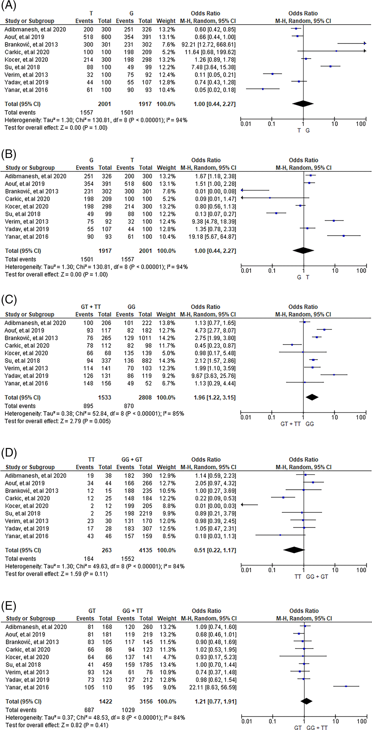 GT vs GG+TT | 9 | 1.21 (0.77-1.91) | 0.41 | 84 | <0.00001 | 0.13326 | Ramdom model |