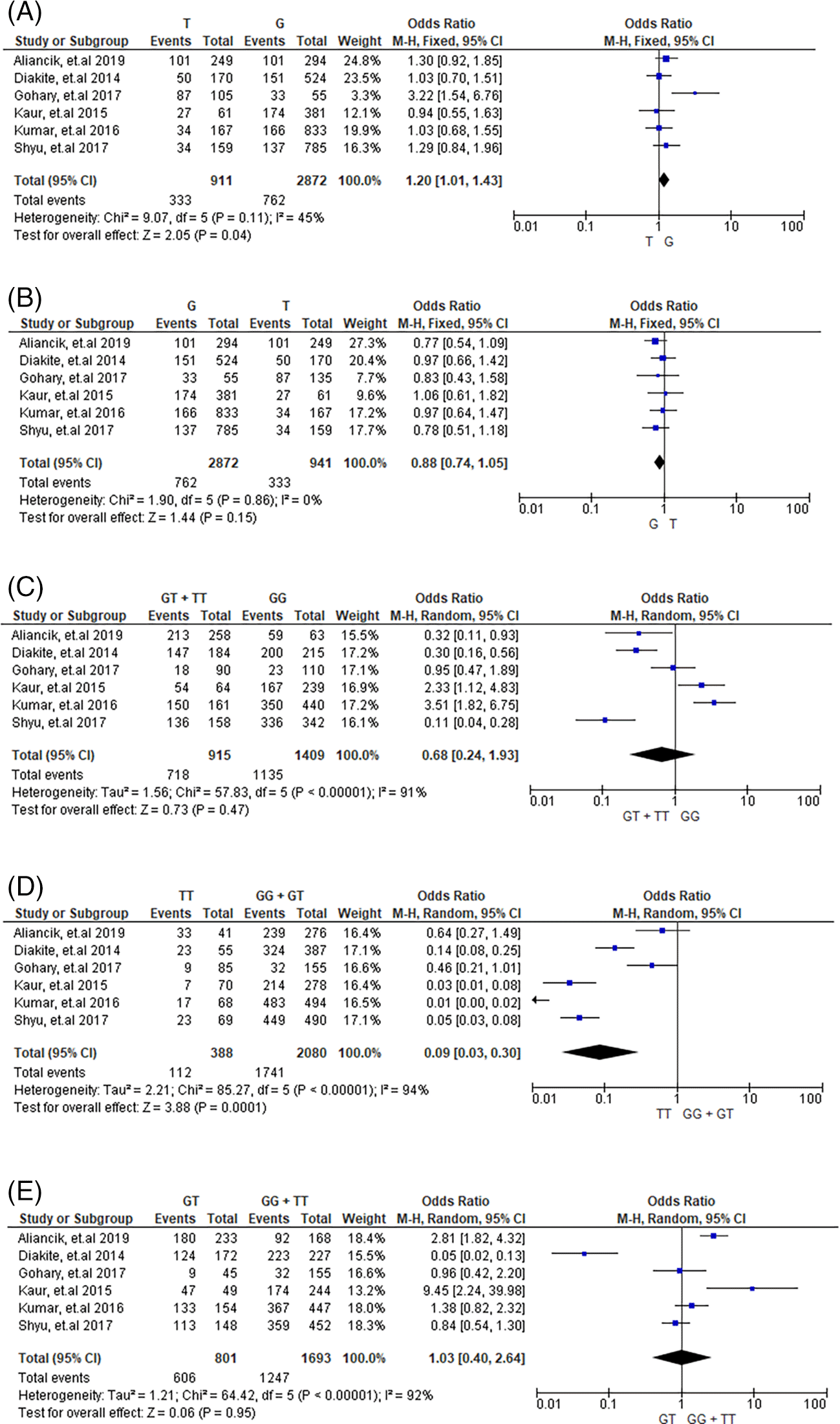 GT+TT versus GG | 6 | 0.68 (0.24-1.93) | 0.47 | 91 | <0.00001 | 0.17523 | Ramdom model |