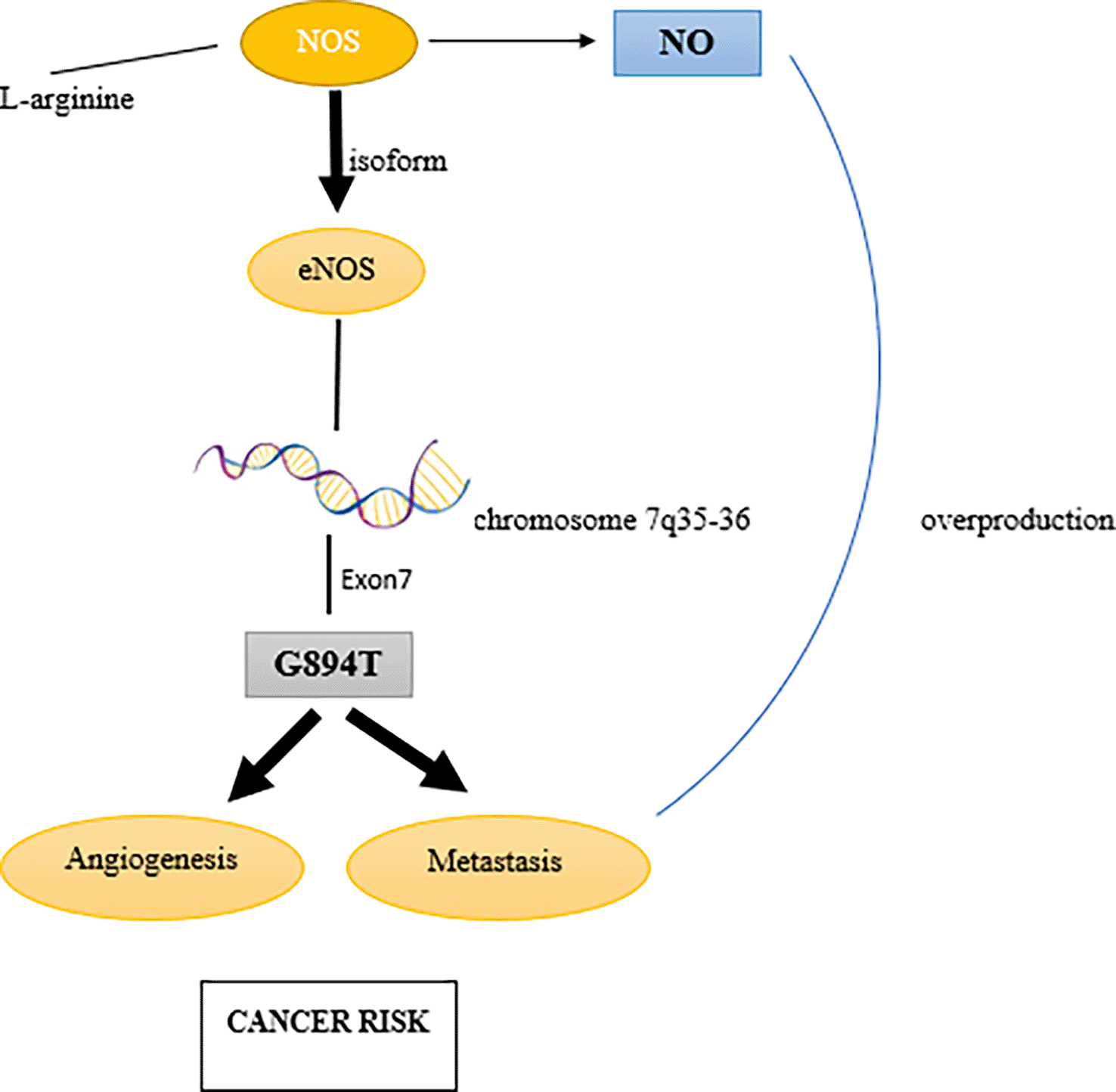 The role of nitric oxide in cancer can be seen in Figure 4. Based on Figure 4, overproduction of NO can facilitate tumor angiogenesis and metastasis. The NOS isoforms that produce NO in the vascular endothelium are defined as endothelial NOS (eNOS), which is found in the endothelium and carries out a crucial role in regulating vascular tone under normal conditions, which is involved in carcinogenesis and contributes to tumor protection (Lim et al., 2008). One possible explanation for the role of this enzyme in cancer progression is that reduced eNOS enzyme activity may lead to a functional decrease in NO levels within the tumor microenvironment, thereby promoting tumor growth. Recently, single nucleotide polymorphisms (SNPs) have been discovered in the eNOS gene. One of these SNPs, located at exon 7 (894G>T). Regarding to the functional role of NO in regulating angiogenesis in cancer, it is possible that this SNP might be positively correlated with the cancer progress by affecting NO synthesis.