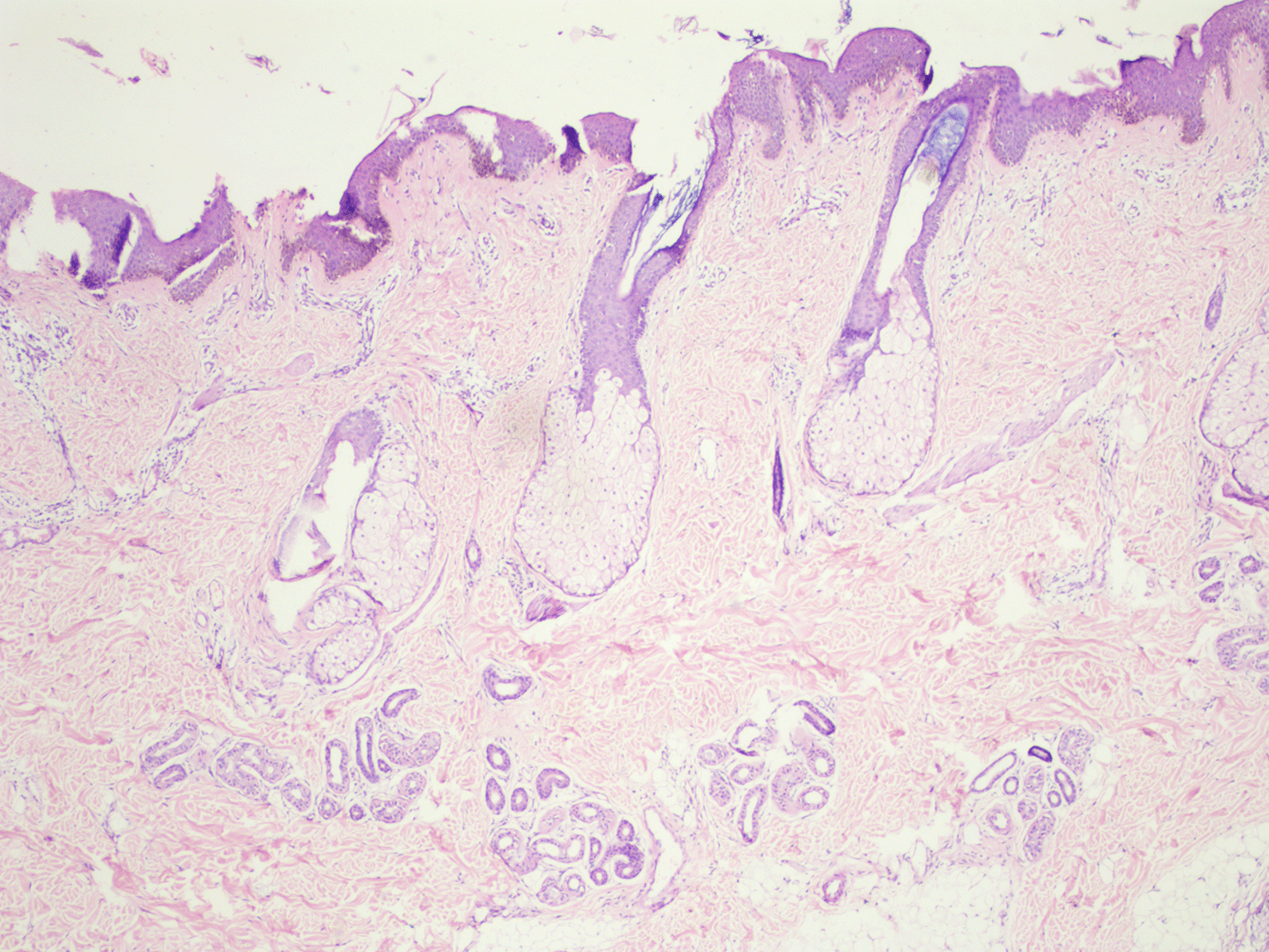 On cutaneous examination, a well-demarcated hyperpigmented verrucous plaque with a size of 8 × 4 cm was present on the frontal area of the scalp extending down to involve the forehead and a 7 × 3 cm plaque was present on the temporoparietal area and left preauricular area [Figure 1]. Based on the patient’s medical history and physical examination, the possible differential diagnoses were identified as congenital melanocytic nevus, giant seborrhoeic keratoses, and verrucous epidermal nevus. However, a thorough examination through dermoscopy and histology conclusively ruled out these possibilities. On dermoscopic examination, ridges and fissures were present in a cerebriform pattern with yellowish-grey globules and a papillary appearance [Figure 2]. Histopathological examination revealed acanthosis, papillomatosis, and mild hyperkeratosis. There were immature and mature sebaceous glands with sebaceous hyperplasia and primitive hair follicles [Figure 3]. The diagnosis of nevus sebaceous was established based on clinical presentation, dermoscopic findings, and histological analysis. The patient was referred to a plastic surgeon on 8th September 2023 for a staged surgical excision of the nevus sebaceous. Our dermatology department does not offer plastic surgery services, hence the referral. Unfortunately, the patient was lost to follow-up after the referral, and we do not have any further information available.
