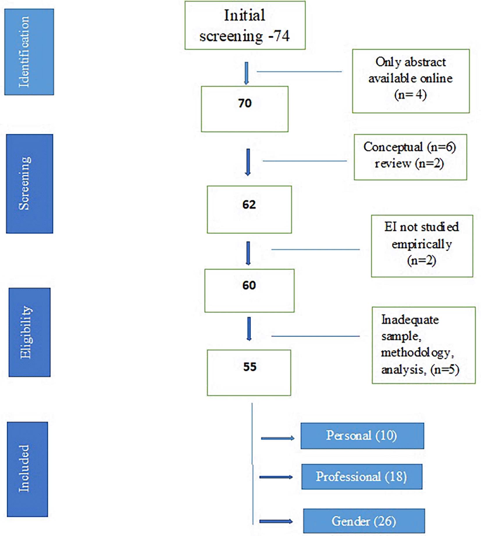 A total of seventy-four studies were identified through the initial literature search. For four studies, only abstracts were available, two were review articles and six papers were conceptual. Two papers had emotional intelligence in the title but it was not the exact parameter studied empirically through a specific tool. Five studies were excluded due to either a very small sample size, or incomplete details about methodology, measuring scales, statistical analysis or final results. The remaining fifty-five studies were included for qualitative analysis. For the purpose of meta-analysis, studies were further grouped on the basis of adequate data regarding impact of age, gender and educational qualification on EI and correlation with another parameter. Ten studies had adequate data for studying correlation of EI with personal health parameters, which were included in first meta-analysis. Eighteen studies had adequate data for studying correlation of EI with professional health parameters, which were included for the second meta-analysis. Thirty-three studies evaluated gender difference in EI, out of which seven did not have an adequate data set. The remaining twenty-six studies were included in the third meta-analysis. Only six studies examined the relationship of EI with age with only four having adequate data. Similarly, there were only seven studies which evaluated the impact of educational qualification on EI and out of them, only five studies had adequate data for analysis. Therefore, no meta-analysis was conducted for age and educational qualification. Figure 1 depicts the process of inclusion and Table 1 presents the summary characteristics of all the studies.