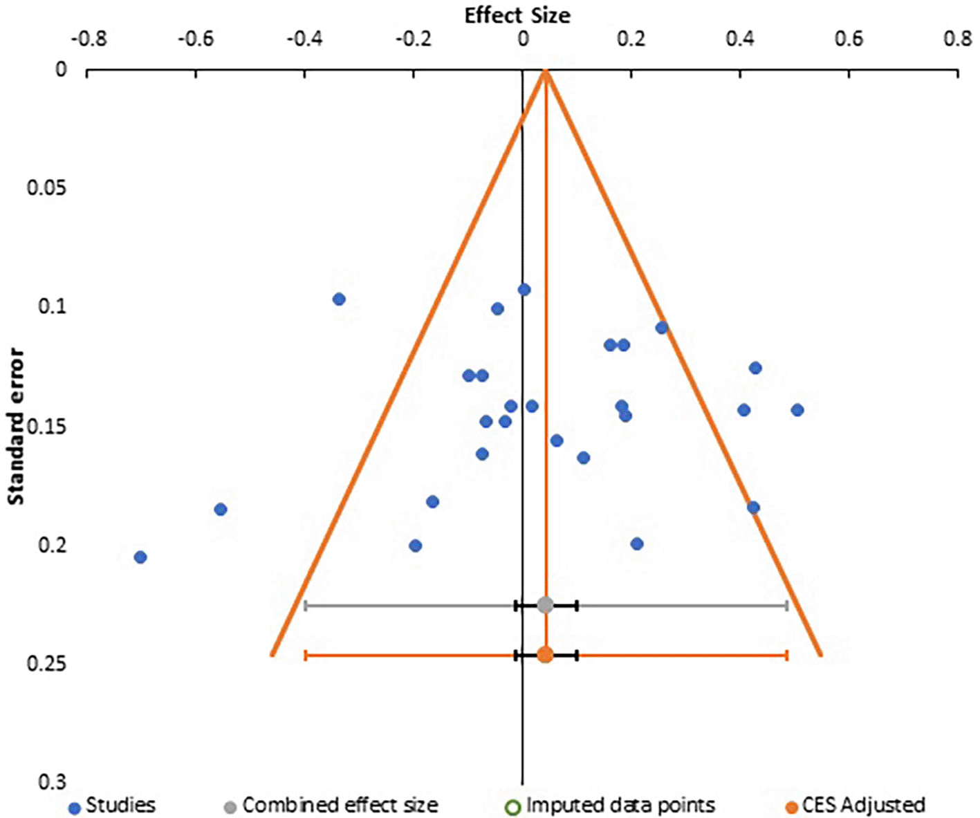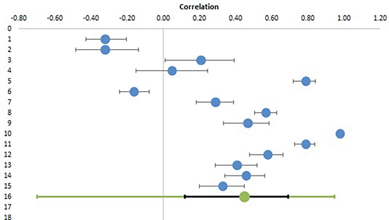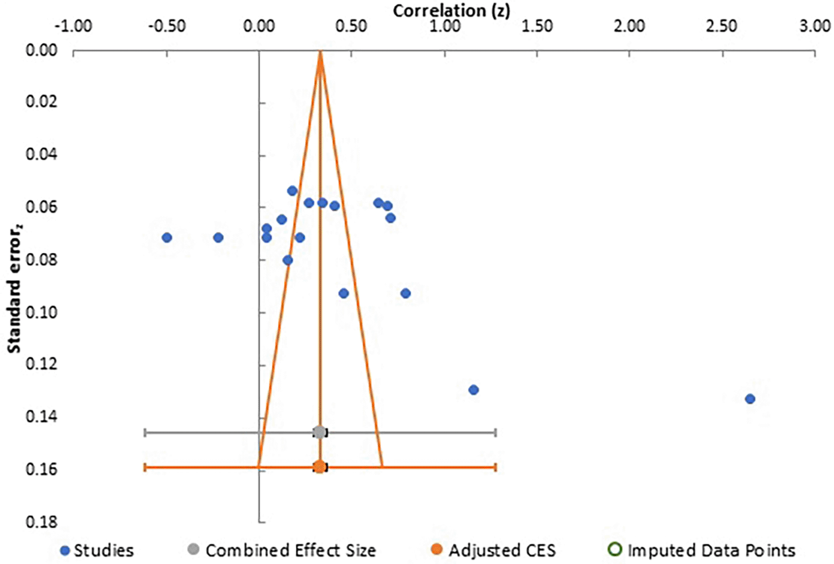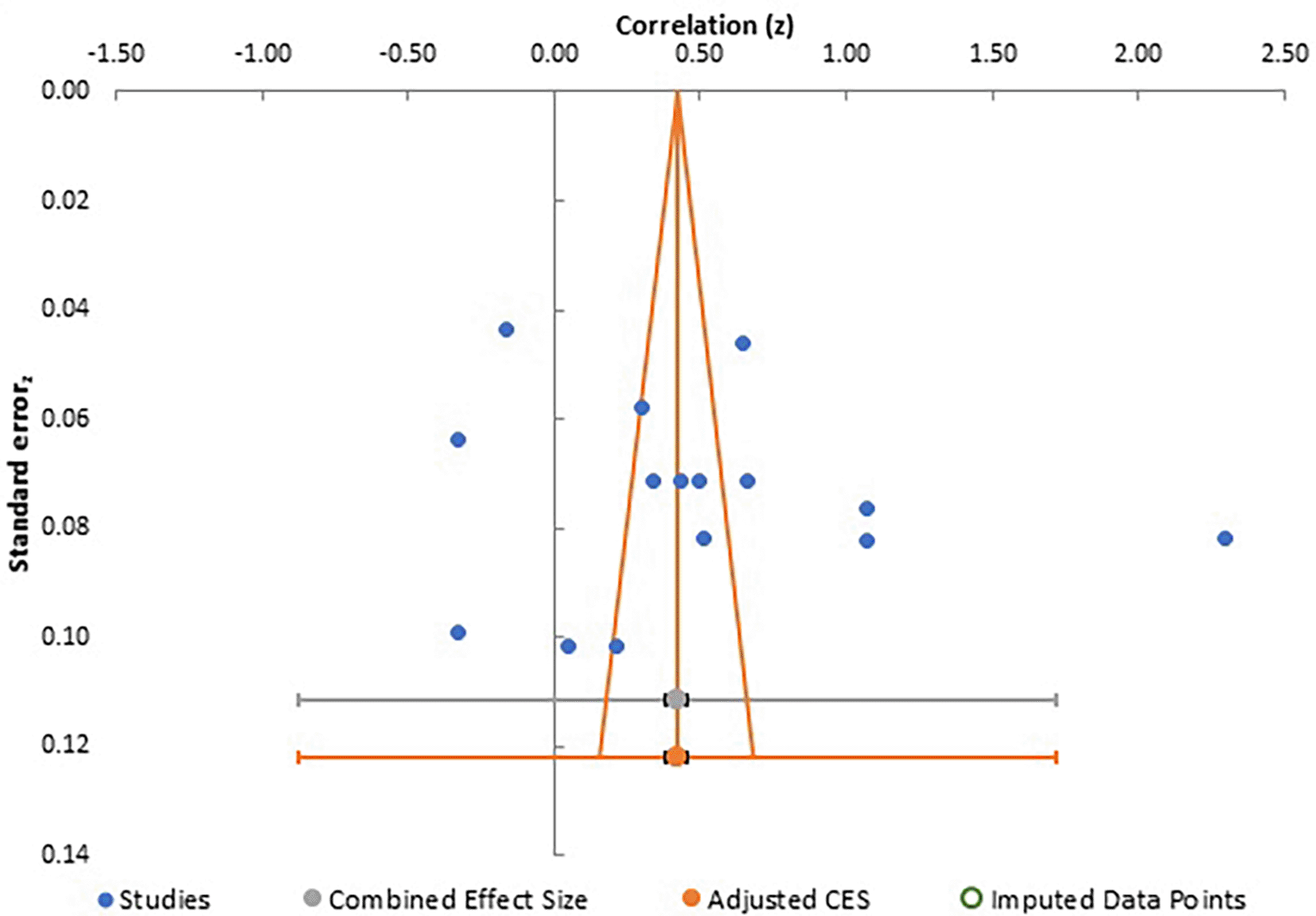 For all three meta-analyses, two alterations were planned namely in sample size and effect size. In the first analysis, studies with a sample size of 100 or less and then less than 200 were removed. For effect size alteration, in the first two meta-analysis, studies with effect size greater than 0.9 and then greater than 0.75 were removed. In the third meta-analysis, this was reduced to effect size greater than 0.5 after an evaluation of the results. The purpose of these alterations is to see how sensitive the final results are to these changes and what is the robustness of the results. As can be seen from Table 13, there is little or no difference in heterogeneity and p values with these changes. In the third meta-analysis, the change in effect size is also minimal. However, in the first two meta-analysis, the effect size drops to some extent with exclusion of studies with a sample size less than 200 and by exclusion of studies with greater effect sizes. As the sample size is inversely related to standard error (which can be a surrogate for the accuracy of results), the results of sensitivity analysis point to the fact that although the relationship between studied parameters is positive and significant, the pooled effect size of more accurate studies is somewhat smaller. This, coupled with a high degree of heterogeneity is further argument for designing future studies with strong methodologies. The sensitivity analysis for the third meta-analysis clearly suggests the robustness of the results, similar to the conclusion of publication bias analysis.