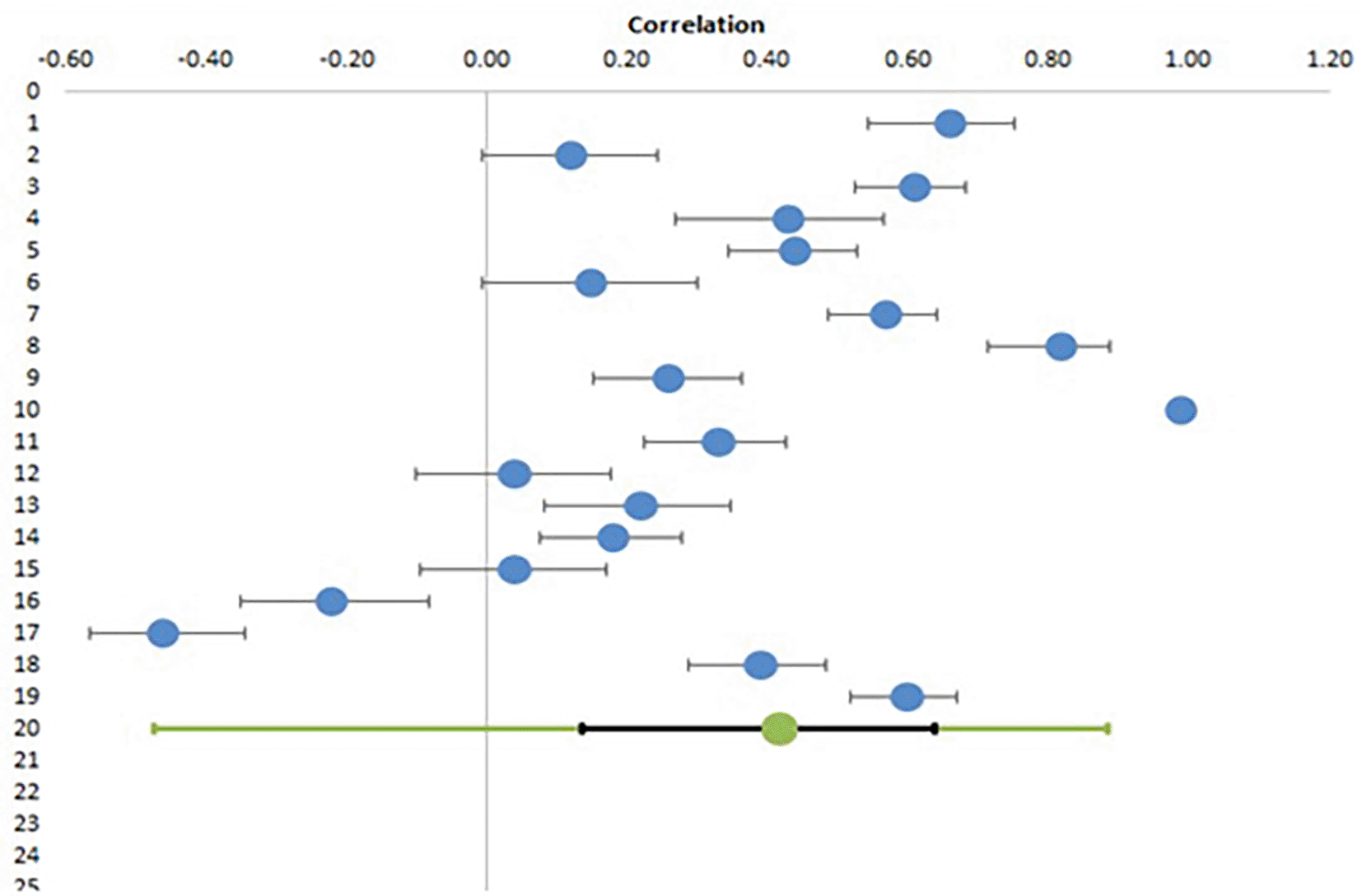 Meta-essentials, a set of free workbooks available online with Excel sheets was used for all statistical analysis (Suurmond et al., 2017). There are standard formats for different types of analysis in this software with readymade excel sheets which require only the correct input at various places and changes in settings as per the requirement of the meta-analysis. For correlation coefficients, it uses Fisher’s r to z transformation for calculation of combined effect size. This avoids the skewness of correlation coefficient and it can be assumed to be normally distributed so that tests of significance can be applied in a meaningful way. Data are presented as summary statistics, meta-analysis with combined effect size calculation, heterogeneity data, Forest plot for graphical representation of effect sizes, subgroup analysis where applicable and publication bias in the form of funnel plot and Egger’s regression. For subgroup analysis, due to the small number of studies, the ‘tau pooled over subgroup’ setting was used. This is done to avoid calculating an imprecise tau square within subgroups as is likely the case when the number of studies is small. For calculation of effect size in meta-analysis of gender effect on EI, the software automatically calculates Hedges’ g for effect size calculation which accounts for the small sample bias which is seen with Cohen’s d. A random effect model was used for calculation of effect size. Although all the studies have been done in India and all use teachers as subjects, there are still differences in the level of educational institutes (from primary level to college/university/professional level), type of institute (government versus private sector), demographics, educational qualifications, sample size and method of sampling (randomized or convenient). Moreover, the various tests used to measure EI and other parameters add to the heterogeneity of the data. Therefore, fixed effect model was not used.