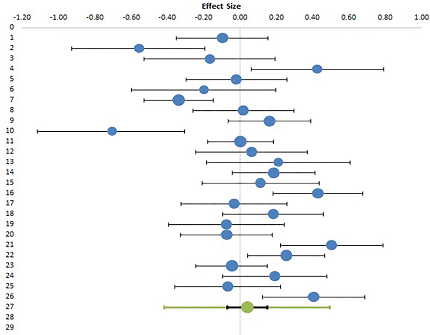 The third meta-analysis was carried out to study the effect of gender on teachers’ EI. Twenty-six papers had adequate data regarding sample size of both genders, mean EI scores and standard deviations. Hedges’ g was used as effect size. The results showed that there is no significant difference in EI between male and female teachers. The combined effect size of 0.04, coupled with a lesser degree of heterogeneity and the least amount of publication bias among the three meta-analyses implies the relatively more robust conclusion regarding lack of gender effect on EI.