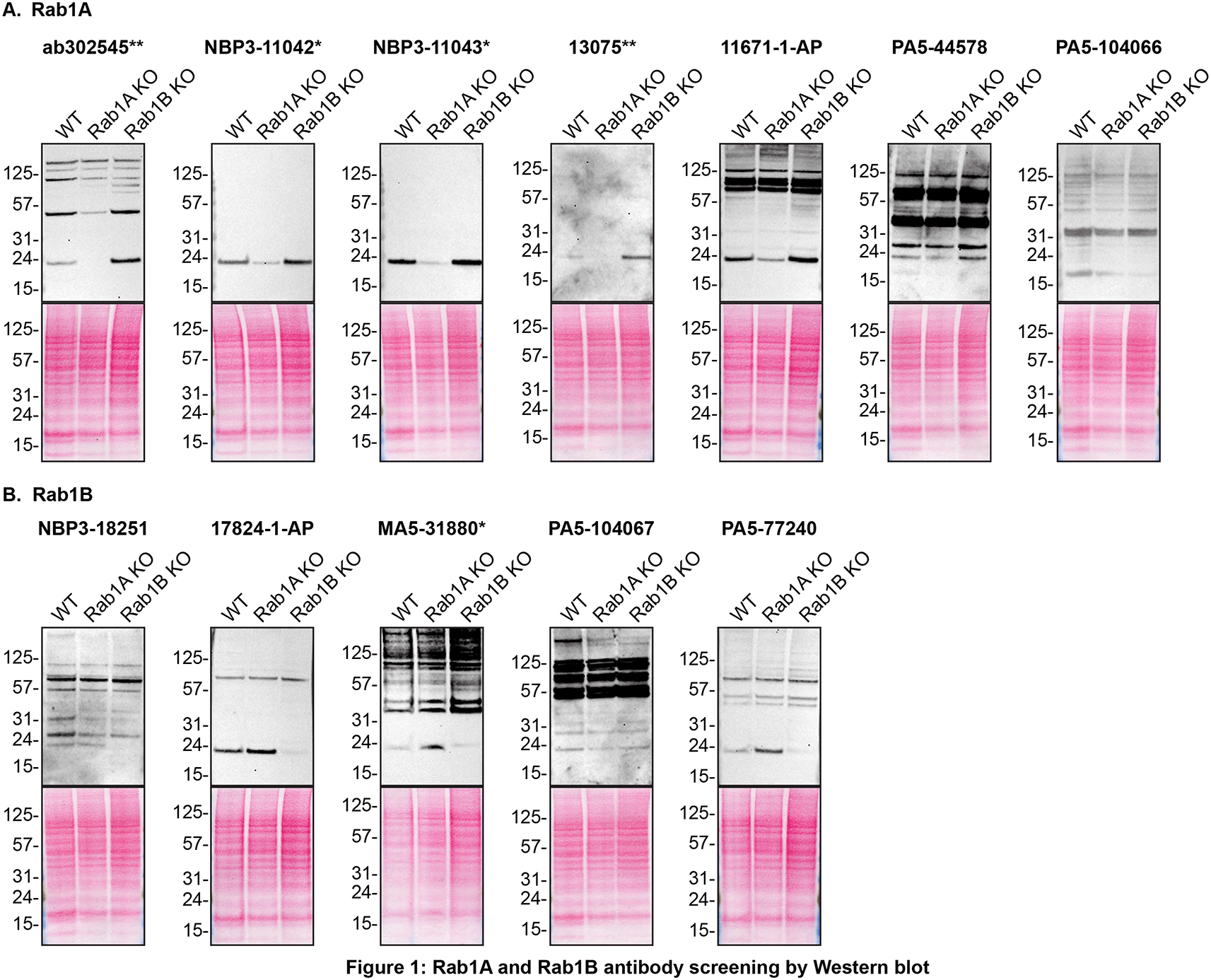 Lysates of HAP1 (WT and RAB1A and RAB1B KO) were prepared and 30 μg of protein were processed for Western Blot with the indicated Rab1A and Rab1B antibodies. Figure 1A represents the findings from the Western Blot experiments for antibodies intended to bind to Rab1A while Figure 1B represents the Western Blots for antibodies intended to bind Rab1B. The Ponceau stained transfers of each Blot are presented to show equal loading of WT and KO lysates and protein transfer efficiency from the acrylamide gels to the nitrocellulose membrane. Antibody dilutions were chosen according to the recommendations of the antibody supplier. Exceptions were given for antibodies ab302545**, NBP3-11042*, 13075**, 11671-1-AP, PA5-104066, 17824-1-AP, PA5-104067 and PA5-77240, which were titrated to the corresponding dilutions found below, as the signals were too weak when following the supplier’s recommendations. Antibody dilution used: ab302545** at 1/200, NBP3-11042* at 1/500, NBP3-11043* at 1/500, 13075** at 1/200, 11671-1-AP at 1/500, PA5-44578 at 1/500, PA5-104066 at 1/500, NBP3-18251 at 1/200, 17824-1-AP at 1/500, MA5-31880* at 1/500, PA5-104067 at 1/200, PA5-77240 at 1/200. Predicted band size: 22 kDa. *Monoclonal antibody, **Recombinant antibody.