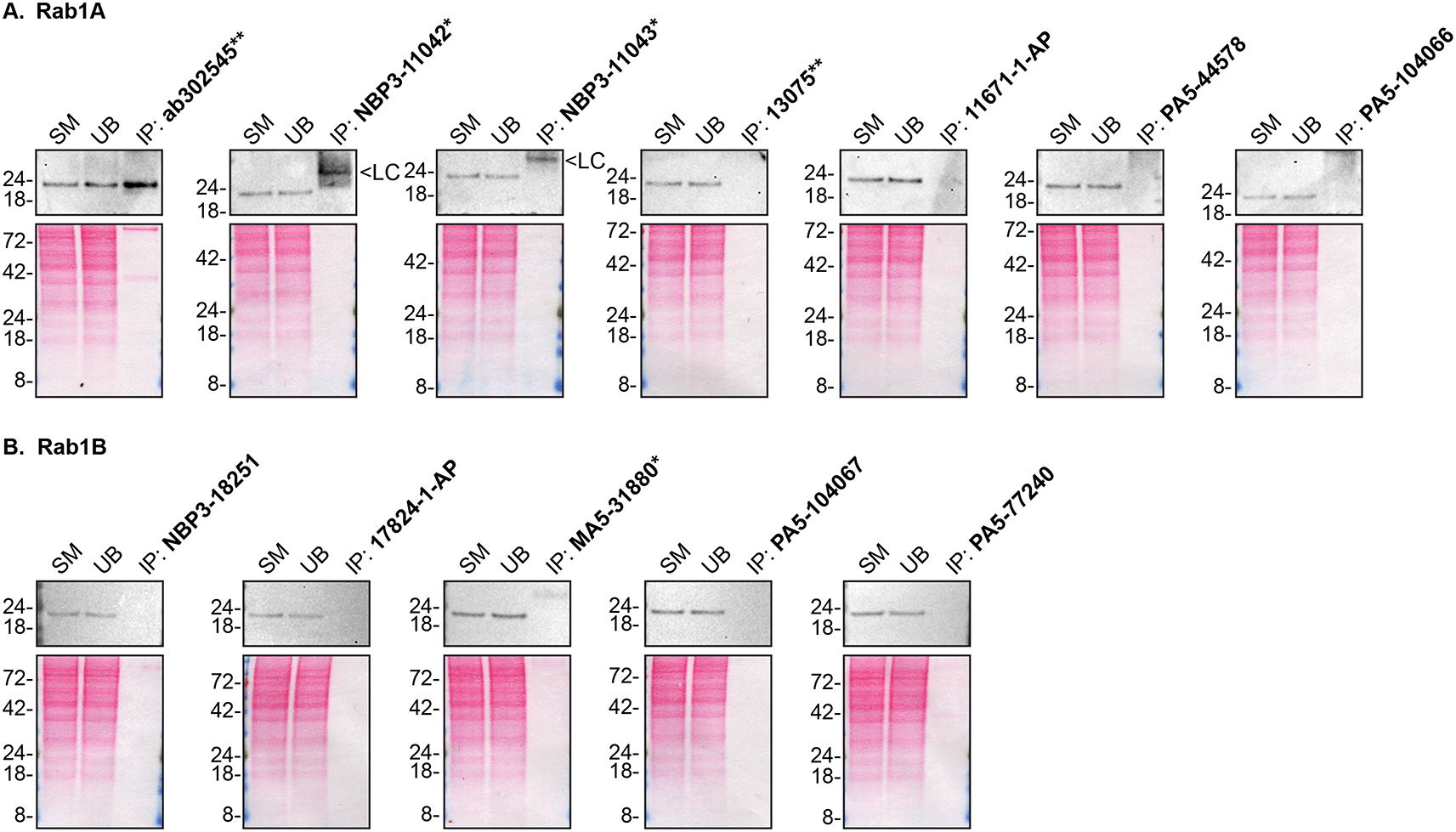 HAP1 lysates were prepared, and IP was performed using 2.0 μg of the indicated Rab1A and Rab1B antibodies pre-coupled to Dynabeads protein A or protein G. Samples were washed and processed for Western Blot with the indicated Rab1A and Rab1B antibodies. Figure 2A represents the IP results for antibodies intended to immunodetect Rab1A while Figure 2B represents the results for antibodies intended to immunodetect Rab1B. For Rab1A Western Blots (A), ab302545** was used at 1/200. For Rab1B Western Blots (B), 17824-1-AP was used at 1/500. The Ponceau stained transfers of each Blot are shown. SM=4% starting material; UB=4% unbound fraction; IP=immunoprecipitate; LC=antibody light chain. *Monoclonal antibody, **Recombinant antibody.