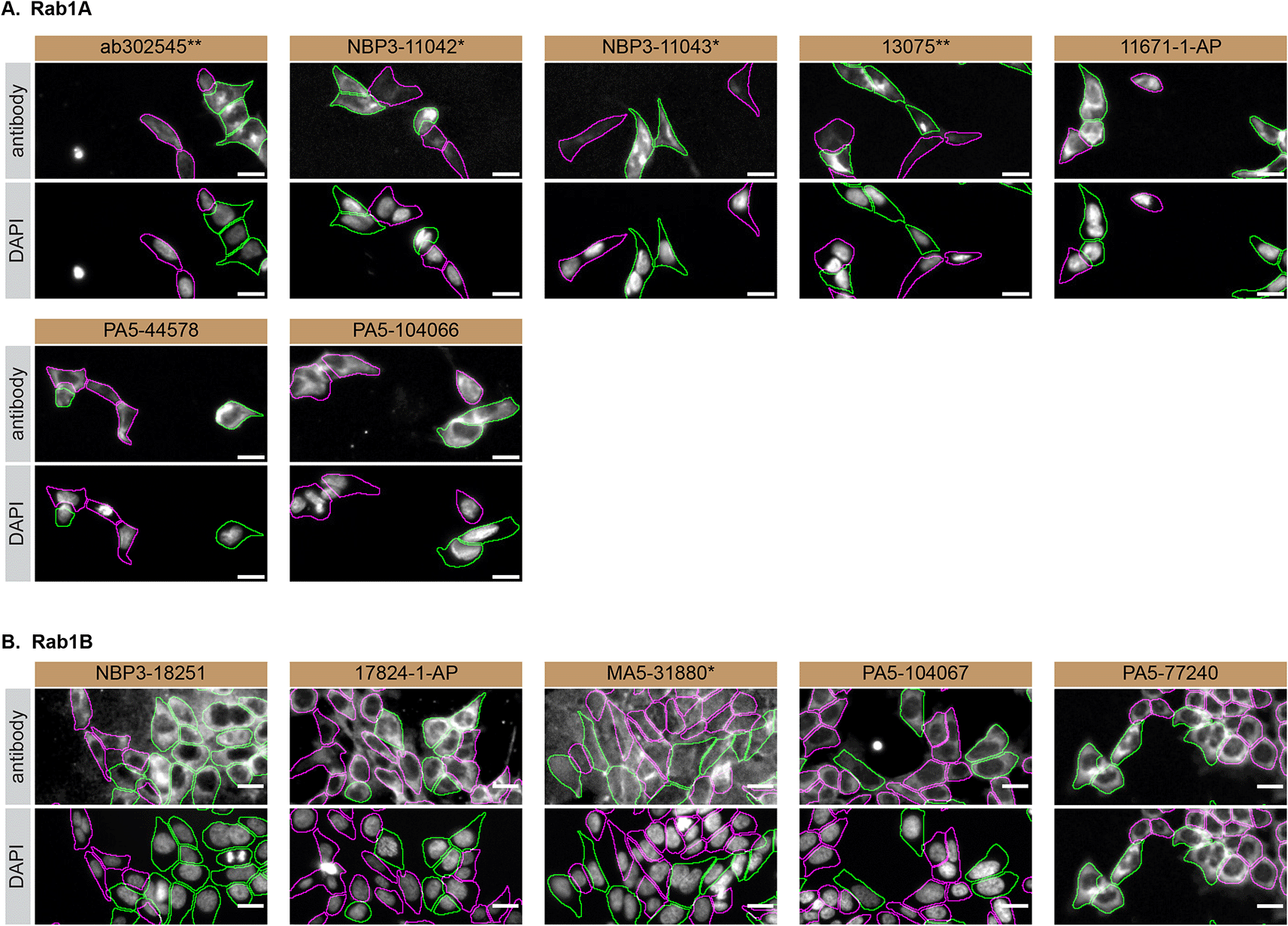 HAP1 WT were labelled with a green fluorescence dye, and HAP1 RAB1A and RAB1B KO cells were labelled with a far-red fluorescent dye. Figure 3A represents WT cells plated together RAB1A KO, while Figure 3B represents WT cells plated with RAB1B KO cells. WT/KO cells are plated to a 1:1 ratio in a 96-well plate with optically clear flat-bottom. In panel (A), WT and RAB1A KO cells were stained with the antibodies intended to target Rab1A, and the corresponding Alexa-fluor 555 coupled secondary antibody including DAPI. In panel (B), WT and RAB1B KO cells were stained with the antibodies intended to target Rab1B, and the corresponding Alexa-fluor 555 coupled secondary antibody including DAPI. Acquisition of the blue (nucleus-DAPI), green (identification of WT cells), red (antibody staining) and far-red (identification of KO cells) channels was performed. Representative images of the merged blue and red (grayscale) channels are shown. WT and KO cells are outlined with green and magenta dashed line, respectively. When the concentration was not indicated by the supplier, we tested antibodies at 1/100 or 1/500, which was the case for antibodies NBP3-11042*, NBP3-11043*, PA5-44578, PA5-104066, NBP3-18251 and 17824-1-AP. At these concentrations, the signal from each antibody was in the range of detection of the microscope used. Antibody dilution used: ab302545** at 1/100, NBP3-11042* at 1/100, NBP3-11043* at 1/100, 13075** at 1/800, 11671-1-AP at 1/700, PA5-44578 at 1/500, PA5-104066 at 1/100, NBP3-18251 at 1/100, 17824-1-AP at 1/50, MA5-31880* at 1/1000, PA5-104067 at 1/1000, PA5-77240 at 1/50. Bars = 10 μm. *Monoclonal antibody, **Recombinant antibody.
