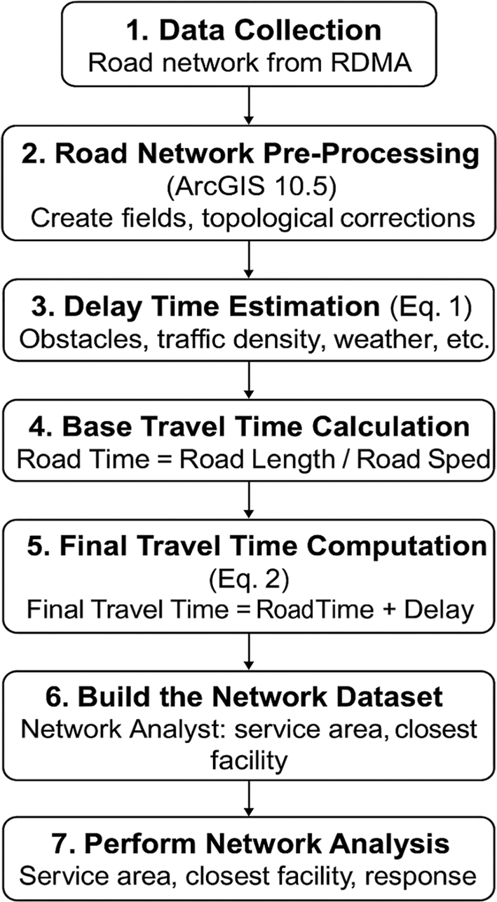 This study improves travel-time estimation by adding delay time into the ArcGIS network analysis ( Figure 3). Previous calculations only used the road length and speed, which often produced inaccurate results during emergencies.