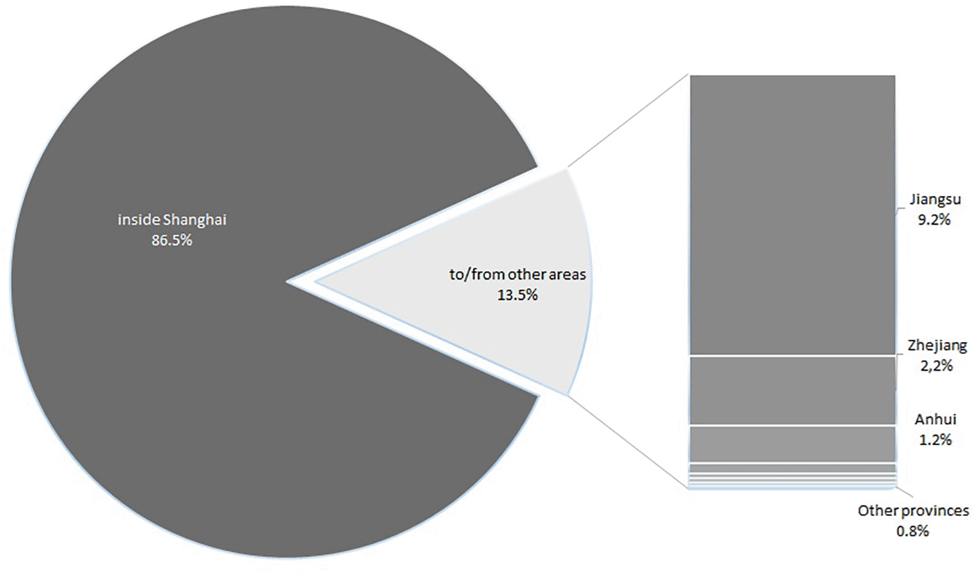 Without patient profiles at this time, we can only compare trips inside Shanghai with trips to/from Shanghai, as patients from other provinces might transfer between hospitals in Shanghai for further rehabilitation. Therefore, the data could not accurately represent the patients from other provinces.