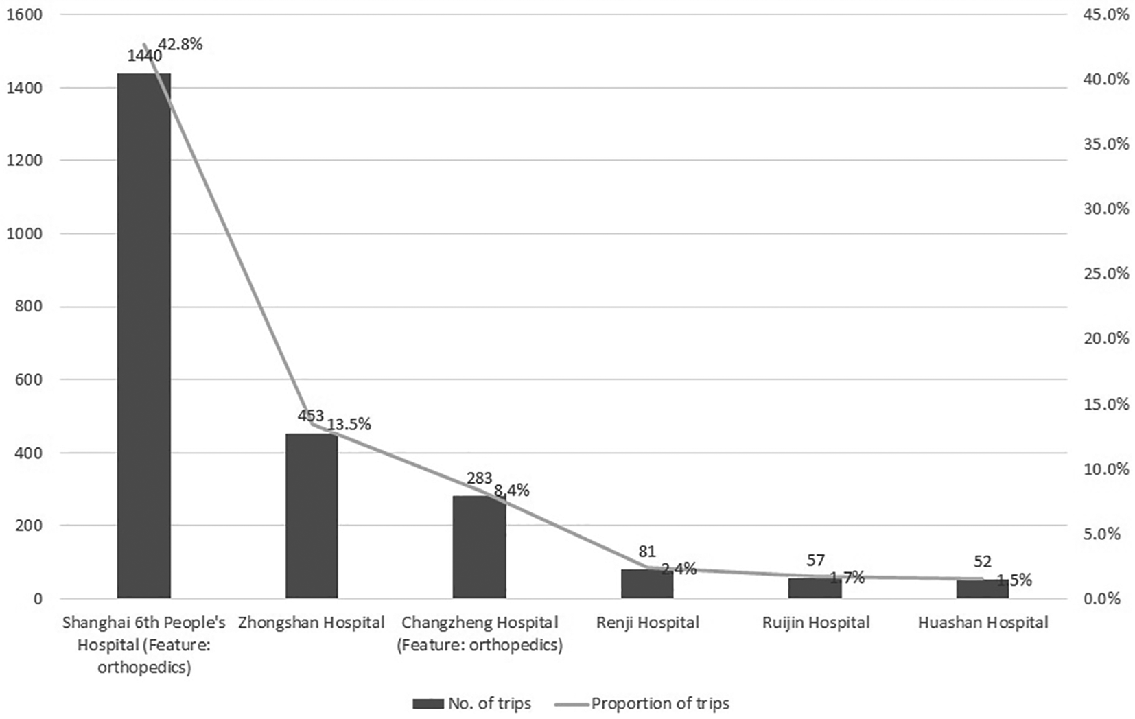 In the group of trips to/from other areas, we classified referrals into referrals to Shanghai and referrals from Shanghai, for it is difficult to evaluate the medical level of hospitals between different areas. Most of the trips in referral type were referrals from Shanghai (136, 93.8%), and there were only eight trips in referrals to Shanghai (5.5%) (Table 2).