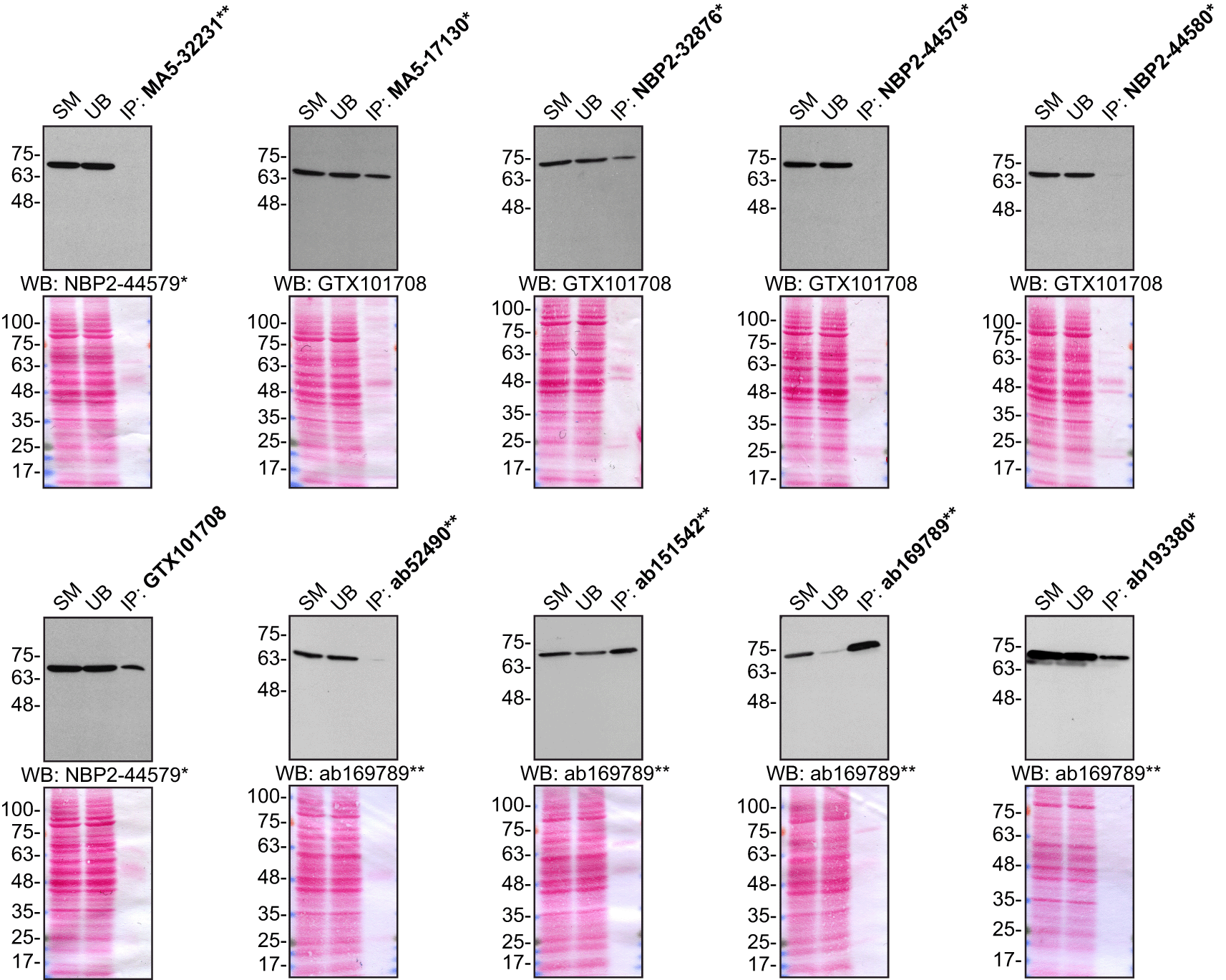 HeLa lysates were prepared, and IP was performed using 1.0 μg of the indicated Moesin antibodies pre-coupled to either protein G or protein A Sepharose beads. Samples were washed and processed for Western Blot with the indicated Moesin antibody. For immunoblot, NBP2-44579*, GTX101708 and ab169789** were used at 1/20000, 1/20000 and 1/10000, respectively. The Ponceau stained transfers of each blot are shown for similar reasons as in Figure 1. SM = 10% starting material; UB = 10% unbound fraction; IP = immunoprecipitate. *Monoclonal antibody, **Recombinant antibody.