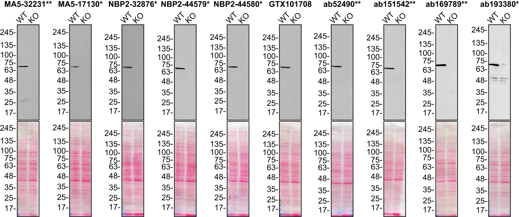 Lysates of HeLa (WT and MSN KO) were prepared, and 25 μg of protein were processed for Western Blot with the indicated Moesin antibodies. The Ponceau stained transfers of each blot are presented to show equal loading of WT and KO lysates and protein transfer efficiency from the acrylamide gels to the nitrocellulose membrane. Antibody dilutions were chosen based on the recommendations provided by suppliers with exceptions for antibodies MA5-32231**, MA5-17130* and GTX101708, which were titrated as the signal received was too strong following the supplier’s recommendations. The antibody dilutions were as follows: MA5-32231** at 1/5000, MA5-17130* at 1/5000, NBP2-32876* at 1/5000, NBP2-44579* at 1/5000, NBP2-44580* at 1/5000, GTX101708 at 1/5000, ab52490** at 1/1000, ab151542** at 1/1000, ab169789** at 1/10000 and ab193380** at 1/400. Predicted band size: 68 kDa. *Monoclonal antibody, **Recombinant antibody.