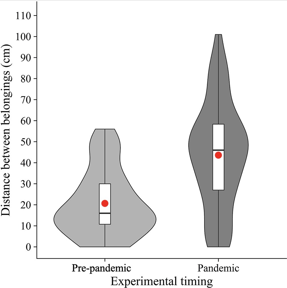As pre-registered, we calculated the mean distance between the nearest edges of belongings (Figure 2). Welch’s unpaired t-test showed that the mean distance was significantly longer in the pandemic condition (M = 43.6, SD = 25.0) than in the pre-pandemic condition (Ariga, 2016; M = 20.6, SD = 15.6) (t(105.63) = 5.88, p < .001, d = 1.10). The results suggest that people place their belongings further away from others in the COVID-19 era, supporting our hypothesis.