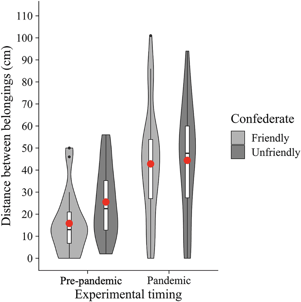 In addition, we conducted an exploratory two-way between-participants ANOVA with the confederate (friendly vs. unfriendly) and experimental timing (pre-pandemic vs. pandemic) as between-participants factors on the distance between belongings (Figure 4). The results showed a significant main effect of the experimental timing (F(1, 104) = 27.39, p < .001, = 0.21). However, neither a significant main effect of the confederate (F(1, 104) = 1.66, p = .20, = 0.02) nor an interaction (F(1, 104) = 0.85, p = .36, = 0.01) were found. These results suggest that people place more distance between their belongings and others' in the COVID-19 era, regardless of whether the other participant (i.e., confederate) was friendly.