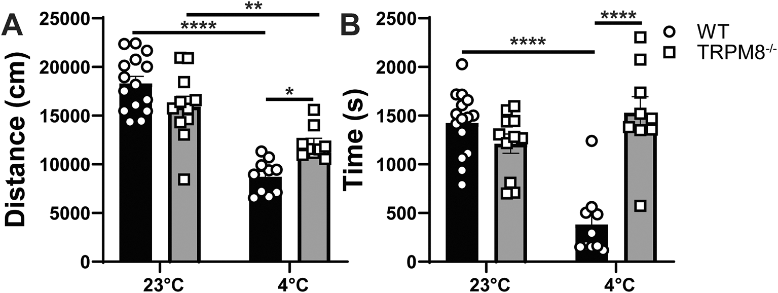 (A) Distance traveled and (B) center time were assessed in WT and Trpm8-/- mice at room temperature (23°C) and in the cold room (4°C). Data represent means ± SEM and compares genotype and temperature using mixed effect analysis with multiple comparisons (Sidak). n=8-15 mice. WT, wild-type; Trpm8, Transient Receptor Potential Subfamily M Member 8. *p<0.05, **p<0.01, ****p<0.0001.