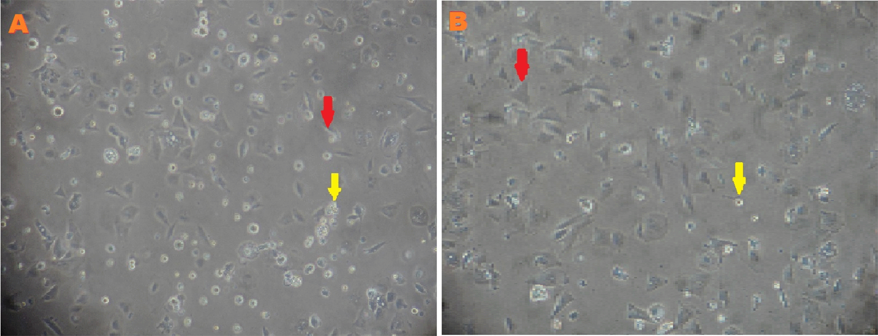 MSCs (red arrow) and cell death (yellow arrow). Magnification at 400×.