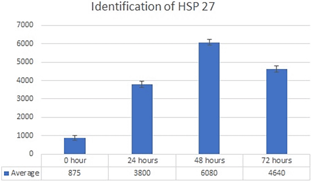 Real-time PCR analysis of HSP27 and caspase-3 expression revealed considerably and significantly increased HSP27 and decreased caspase-3 under low oxygen tension (O2 1%; p<0.01) compared with those under the normoxic culture as a control (Figures 2 and 3).
