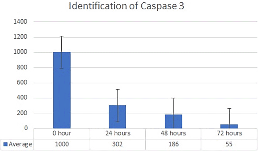 Furthermore, IHC of cells cultured under low-O2 (O2 1%) conditions until 72 h exhibited a small number of apoptotic cells (5%) compared with those cultured under a normoxic condition (O2 21%), which showed an apoptotic cell number of 25% (Figure 4). The study results were supported by several studies that stated that under low-O2 (O2 1%) conditions, the stem cells decreased the level of apoptosis. 21 , 22 The incidence of apoptosis was between 2.45% and 2.55% under low O2 for 24, 48, and 72 h compared with a number of cells that were cultured under normoxic (O2 21%) conditions, in which the apoptotic cell number reached 12.5%. 23 , 24 In vitro culture of stem cells required the same treatment as those maintained in vivo because stem cells require a hypoxic condition (a low concentration of O2) to maintain self-renewal, 25 viability, 26 and slow proliferation based on the location and type of the stem cells. 27 , 28