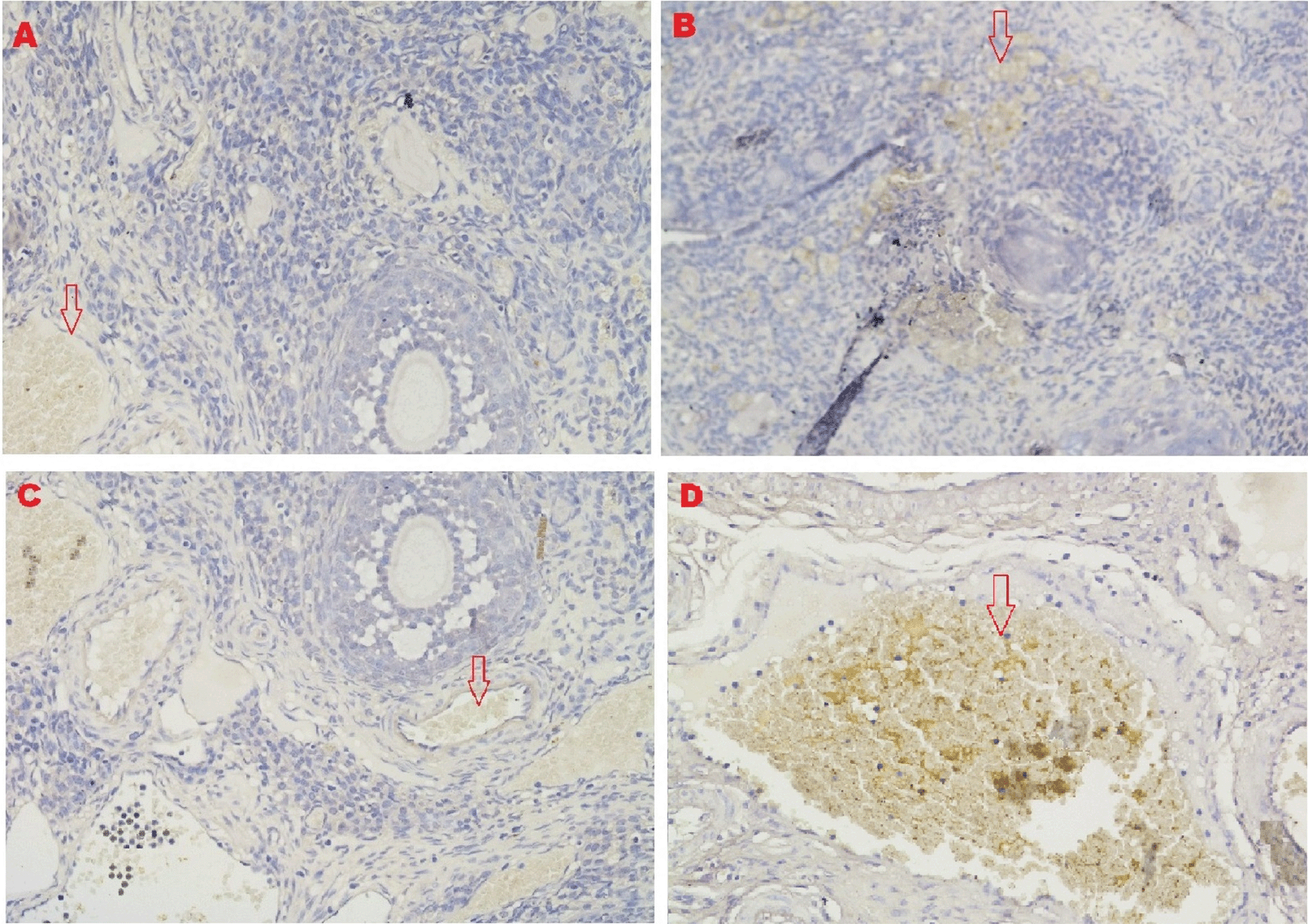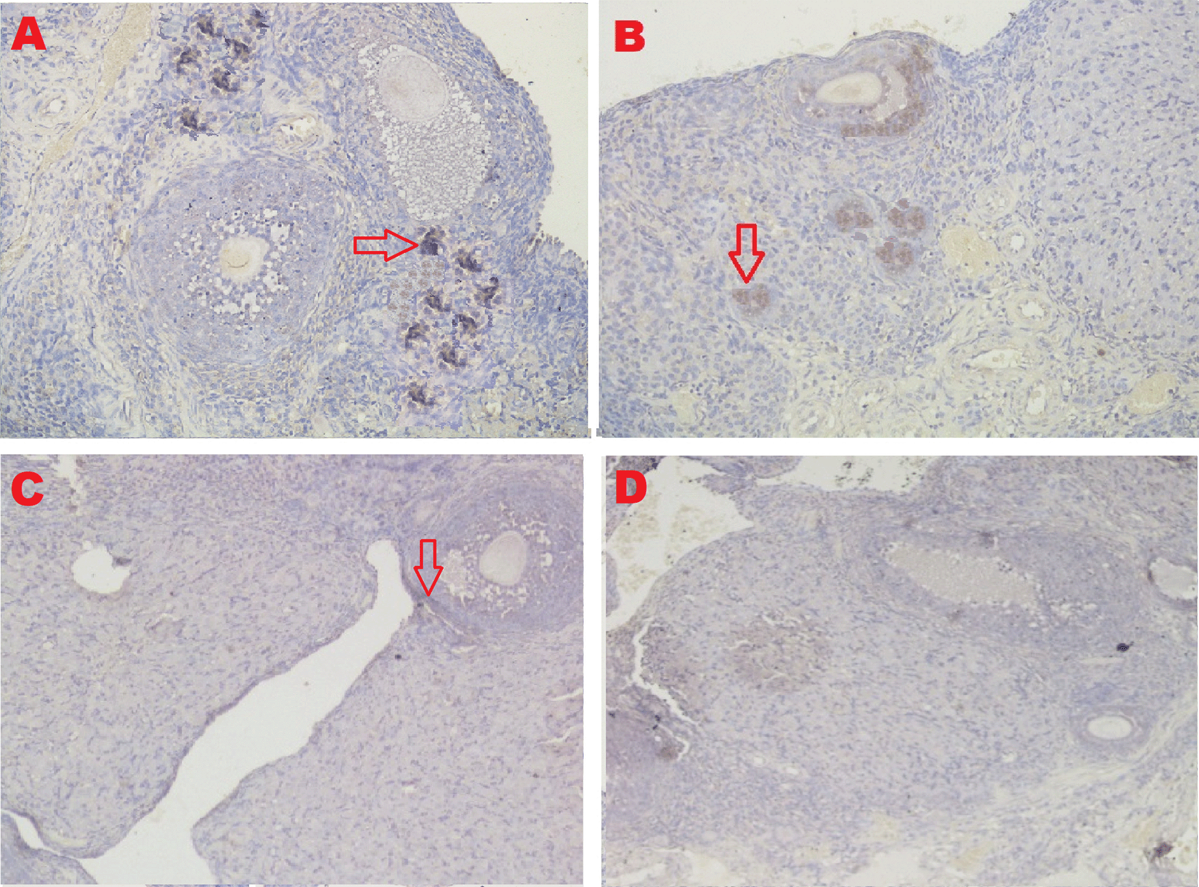 The IHC score for caspase-3 expression in ovarian tissue from four treatments is shown in Figures 3, 6 and Table 2. As shown in Table 2, the average score of caspase-3 expression (brown) was 0.2a±0.42 for the positive (fertile) control group, 0.6a±0.52 for the T2 group, 4.8b±1.03 for the T1 group, and 7.3c±1.42 for the negative (infertile) control group.