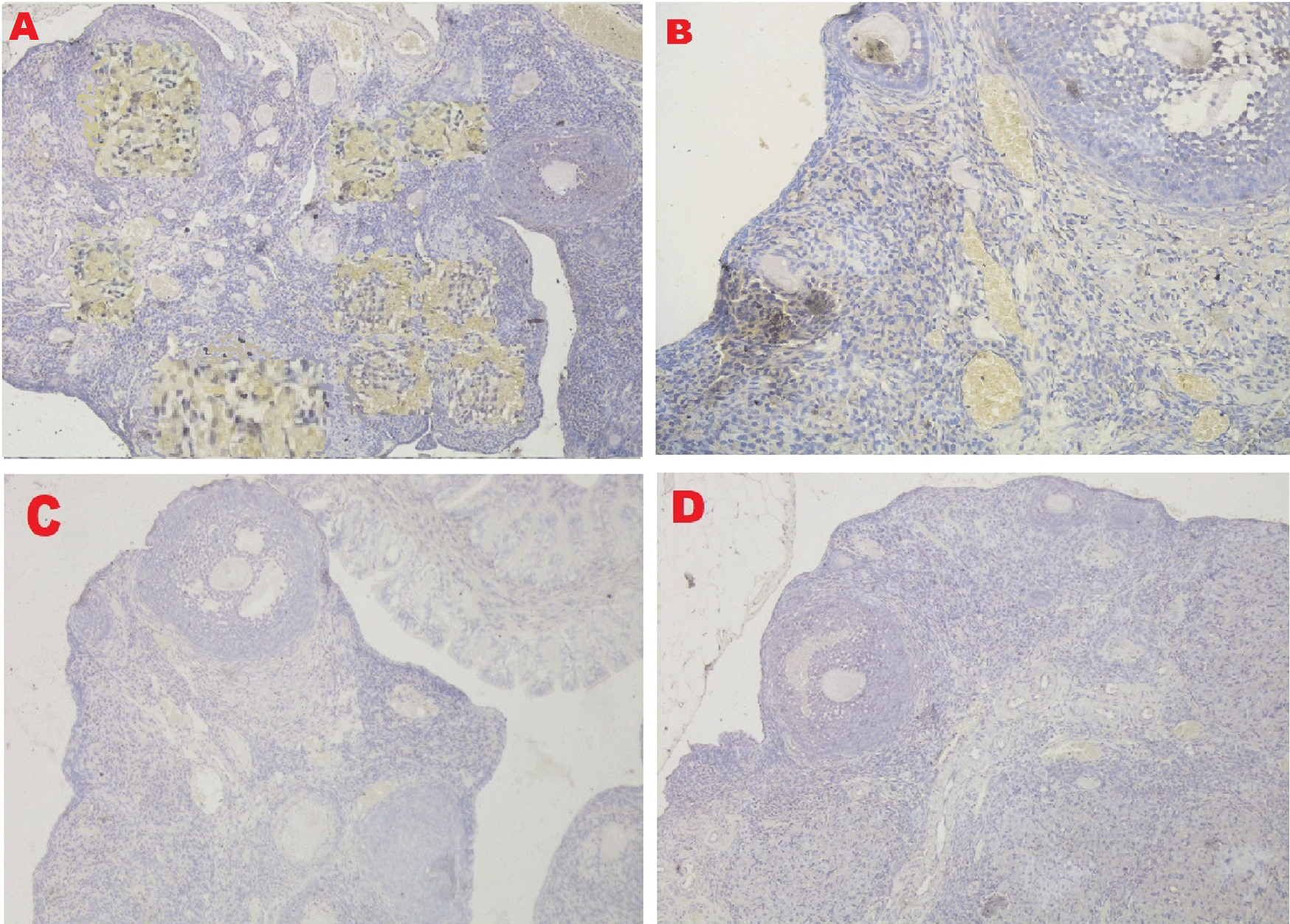 The IHC score of the GDF-9 expression in ovarian tissue from four treatments is shown in Figure 8 and Table 2. As shown in Table 2, the average score of the GDF-9 expression (brown) was 5.8c±1.47 for the positive control group (fertile rats), 4.6b±0.97 for the T2 group, 0.5a±0.53 for the T1 group, and 0.3a±0.48 for the negative control group (infertile rats).