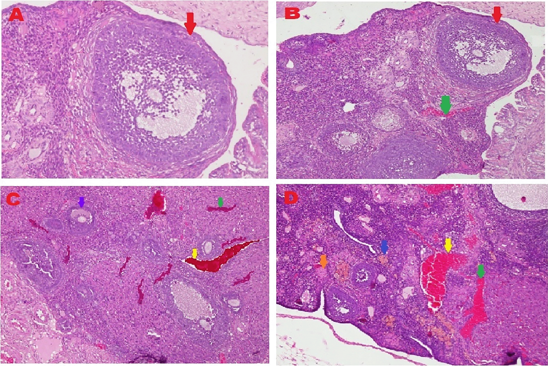 A 10% formalin solution was used to fix the tissues of the ovaries. Subsequently, the ovaries were dehydrated using a series of progressively increasing alcohol concentrations, cleaned with xylol, and fixed in paraffin. Routine staining was performed on thin sections and placed on slides. 26