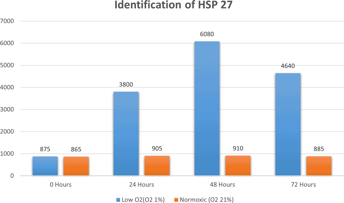 The results of this research indicated that low O2 can inhibit apoptosis. Based on real-time PCR, the expression of HSP27 and caspase-3 was detected. This result indicated significantly increased HSP27 and decreased caspase-3 expressions in cells in vitro cultured with low oxygen tension (O2 1%, p<0.05) compared with those in cells cultured under normoxic conditions, which served as the control (Figures 2 and 3). This research was consistent with a previous study,15 which reported that low O2 had a significant effect on apoptotic resistance, as indicated by the expression of HSP27. The study indicated that low O2 could reduce apoptosis by increasing HSP27 expression and decreasing caspase-3 expression. Caspase-3 is a marker of apoptosis; thus, a decrease in caspase-3 indicated that low O2 could reduce apoptosis.20