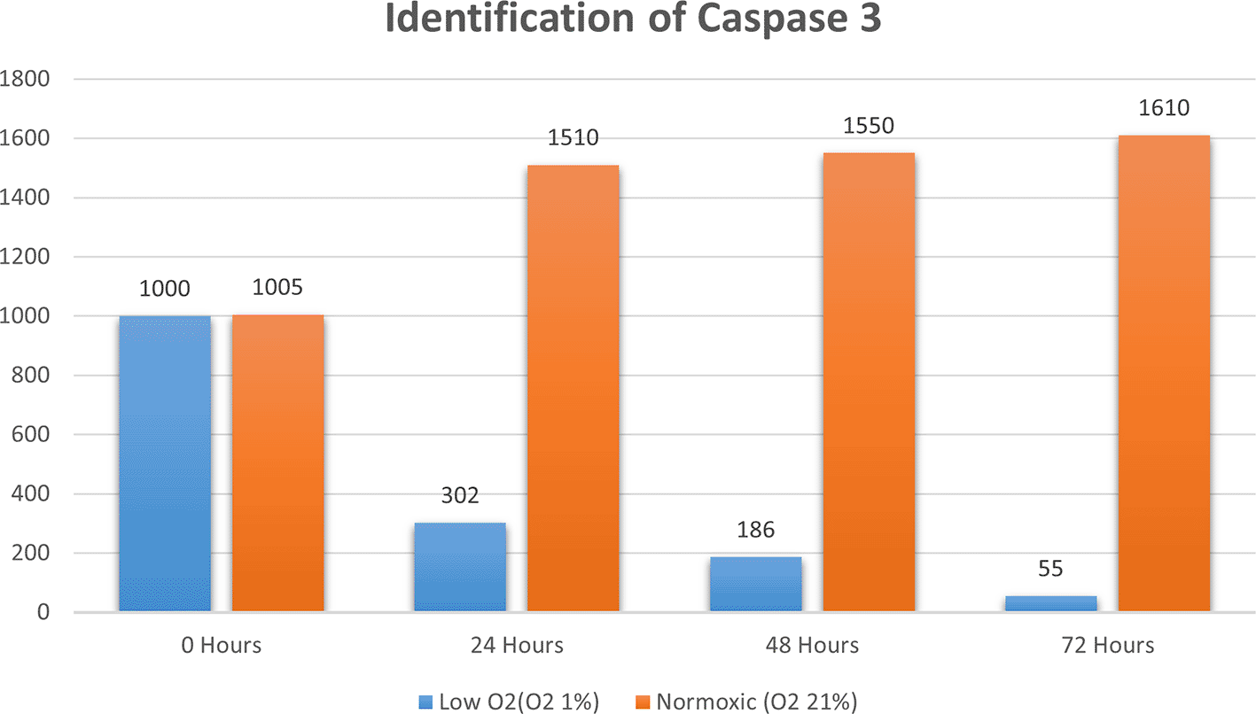 Furthermore, IHC of cells cultured under low-O2 (O2 1%) conditions until 72 h exhibited a small number of apoptotic cells (5%) compared with those cultured under a normoxic condition (O2 21%), which showed an apoptotic cell number of 25% (Figure 4). The study results were supported by several studies that stated that under low-O2 (O2 1%) conditions, the stem cells decreased the level of apoptosis.21,22 The incidence of apoptosis was between 2.45% and 2.55% under low O2 for 24, 48, and 72 h compared with a number of cells that were cultured under normoxic (O2 21%) conditions, in which the apoptotic cell number reached 12.5%.23,24 In vitro culture of stem cells required the same treatment as those maintained in vivo because stem cells require a hypoxic condition (a low concentration of O2) to maintain self-renewal,25 viability,26 and slow proliferation based on the location and type of the stem cells.27,28
