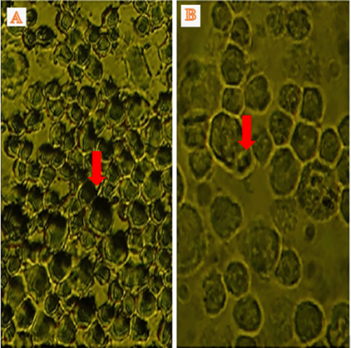MSCs (red arrow) and cell death (yellow arrow). Magnification at 400×.